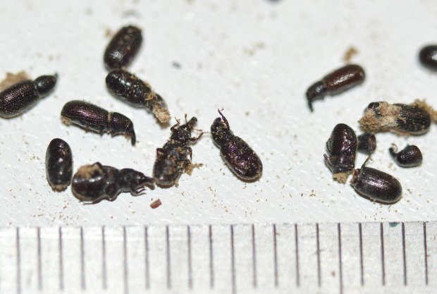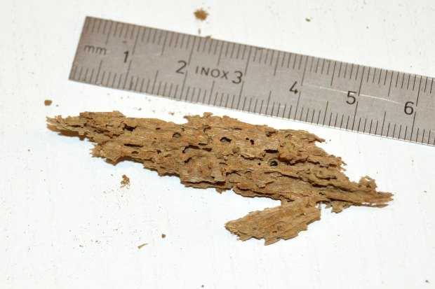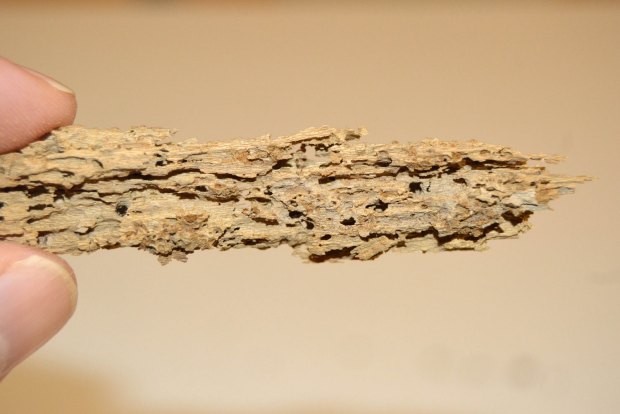 Hace unos días encontré el trozo de madera que se puede ver en la imagen número 1. Medía unos 75 centímetros de largo y estaba en muy mal estado. Formaba parte de un marco de la puerta de una ducha. La madera se encontraba suelta. La observé y vi que había gorgojos xilófagos (Curculionidae). Esta pieza se encontraba sujeta a una humectación diaria. Así que los hongos habían hecho una parte del trabajo y los gorgojos otra.
