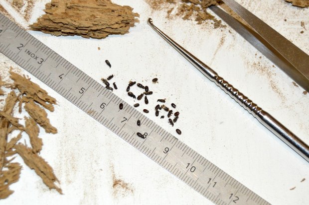 Me entretuve un rato en buscar ejemplares de gorgojos para saber de qué especie se trataba. Cuando conseguí unos cuantos, los puse debajo de la lupa binocular y vi que se trataba de Pselactus spadix. Me resultan muy interesantes estos coleópteros que aprovechan la madera que otros coleópteros xilófagos como los anóbidos (Anobiidae) no pueden aprovechar. Pero, en concreto, me resulta fascinante la vida de Pselactus spadix por dos aspectos. El primero es que puede completar todo su ciclo de vida sin necesidad de salir al exterior. El macho y la hembra realizan la cópula en las galerías y allí es realizada la puesta. Y el segundo es que no vuela. Y a pesar de tener esta vida tan oculta e inmóvil, es capaz de llegar a madera puesta en obra y minarla si las condiciones son adecuadas. Todo un misterio. Aunque sí es cierto que este gorgojo se encuentra en el medio natural. A su favor está el hecho de que los adultos son longevos hasta 12 meses. Esto quizás le da posibilidades de llegar a nuevas maderas.