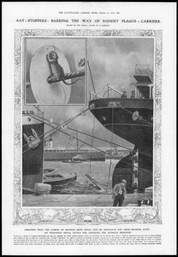 El 25 de marzo de 1911 fue publicado en el periódico inglés ‘The Illustrated London News’ una noticia titulada ‘Rat-stoppers: barring the way of rodent plague-carriers’ (figura 3). Esta noticia fue acompañada de dibujos que daban a entender en qué consistían los rat-stoppers. Se presenta como un nuevo dispositivo diseñado para que las amarras de los barcos no sean carreteras para las ratas pestosas. Como se puede ver, la forma de este protector no es de cono, sino que es plano. Desconozco el modelo de esta noticia con qué patente de entonces se corresponde. Sin embargo, de principios de la década de 1910 constan dos patentes inglesas. Una fue publicada el 7 de septiembre de 1911 asignada a Harry Kent de Essex y titulada ‘Improved Rat Guard for Ships Moorings and the like’ [2]. Y otra patente fue publicada un año después el 4 de julio de 1912 asignada a John Tombs de Londres y titulada ‘Improvements relating to Rat-guards for Attachment to Hawsers or Ropes Leading from Ship to Shore or the like’ [3].