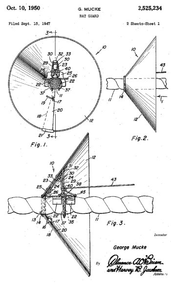 [10] US2525234A. Rat Guard. Inventor: George Muke, Baldwin, New York. Appiclation Date: 15-09-1947. Publication Date: 10-10-1950.