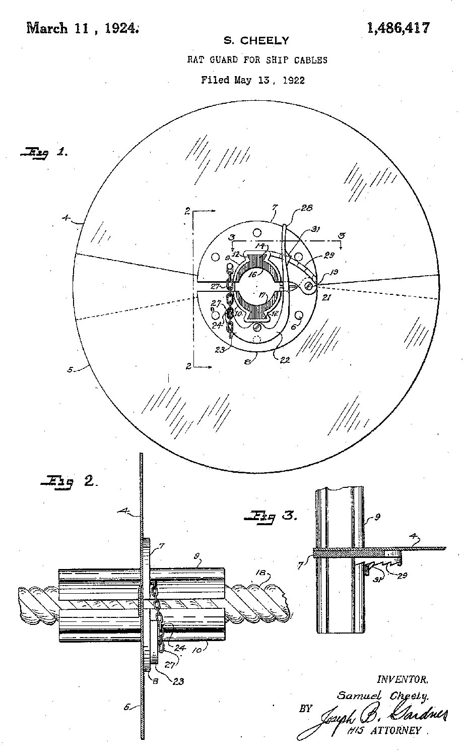 [6] US1486417A. Rat guard for ship cables. Inventor: Samuel Cheely, Lodi, California. Application Date: 13-05-1922. Publication Date: 11-03-1924.