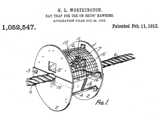 [5] US1052547A. Rat-trap for use on ships’ hawsers. Inventor: Hamilton Labatt Worthington. Application Date: 26-10-1910. Publication Date: 11-02-1913.