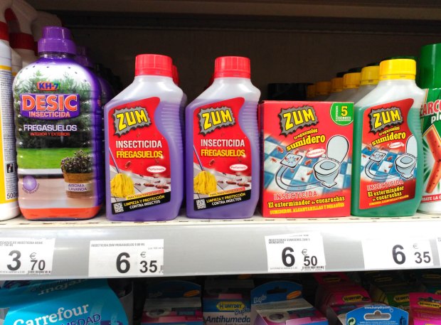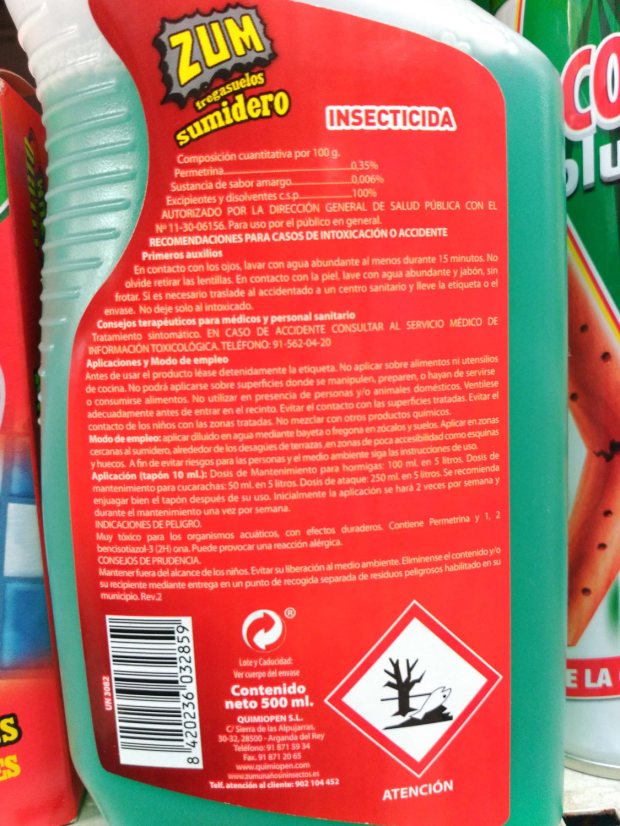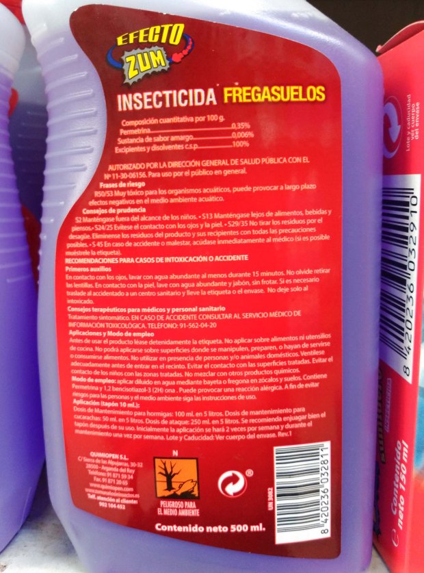 En la imagen número 1, se puede ver un lineal de un hipermercado en el que están expuestos productos insecticidas para fregar el suelo. Estos productos se comercializan para uso doméstico. Y opino que son una marranada en toda regla que no deberían estar a la venta. Están formulados a base de permetrina e implican graves peligros. El primero es que se aplica sobre el suelo de manera extensiva. Es lo más alejado del control integrado de plagas que pide tratamientos dirigidos. Y por el suelo van los niños. En segundo lugar, es que alguien puede decidir mezclarlo con otro producto de limpieza. No sabemos qué puede pasar. Y en tercer lugar, alguien puede decidir mezclarlo con agua caliente, lo cual significa que la permetrina pasará a formar parte del aire que se respira.