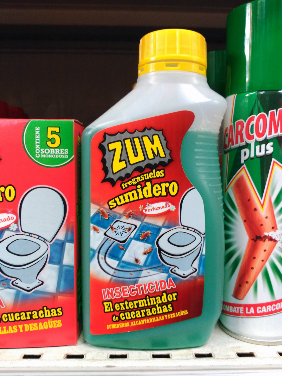 El segundo producto insecticida para fregar el suelo en aparecer en el mercado fue Zum Insecticida Fregasuelos (figura 2). Su número de registro es el 11-30-06156 y en su composición lleva permetrina al 0’35%. Hasta aquí todo correcto. Sin embargo, el pasado fin de semana me pasé por un hipermercado y aproveché para ver los productos insecticidas. Y pude ver que junto a Zum Insecticida Fregasuelos, había otro de la misma marca que se llamaba Zum Fregasuelos Sumidero (figura 4). Y como subtítulo pude leer: «El exterminador de cucarachas. Sumideros, alcantarillas y desagües.» Y en la etiqueta se podía ver un sumidero y un inodoro. Leído el nombre del producto y visto el dibujo, cualquier persona deduce que el producto está pensado para tirar por el sumidero y por el inodoro para eliminar las cucarachas. Me quedé a cuadros. Tirar insecticida por los desagües no solo está prohibido sino que es un atentado contra el medio ambiente. Lo peor del caso es que había dos envases diferentes de este producto. En la imagen número 4, se puede ver un envase de cartón en el que hay 5 sobres monodosis para mezclar con agua. Y en la imagen número 5, se puede ver un envase de plástico de medio litro idéntico al de Zum Insecticida Fregasuelos.