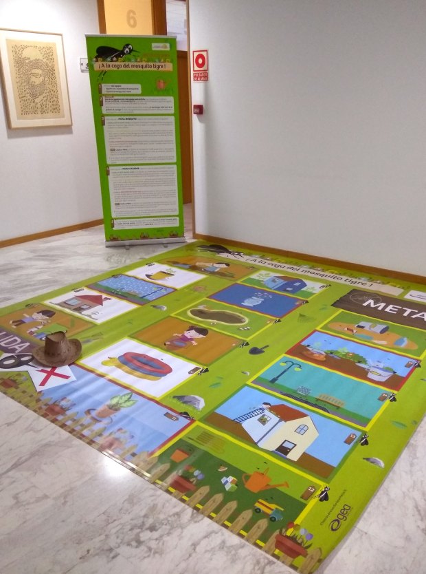 «El juego se basa en hacer una pequeña charla previa sobre el mosquito tigre, su ecología y sus hábitos, así como sobre la guía de buenas prácticas ciudadanas para minimizar su desarrollo. Una vez los niños tienen la información se hacen dos equipos: cazadores de mosquitos y mosquitos tigre. Eligen a un niño de cada equipo como pieza en el tablero, el cual se pone el gorro de cazador o la careta, respectivamente. Van tirando los dados y siguen las instrucciones para avanzar por el tablero, conseguir puntos y ganar la partida. Se juega un tiempo acordado y el que más puntos tiene gana.»