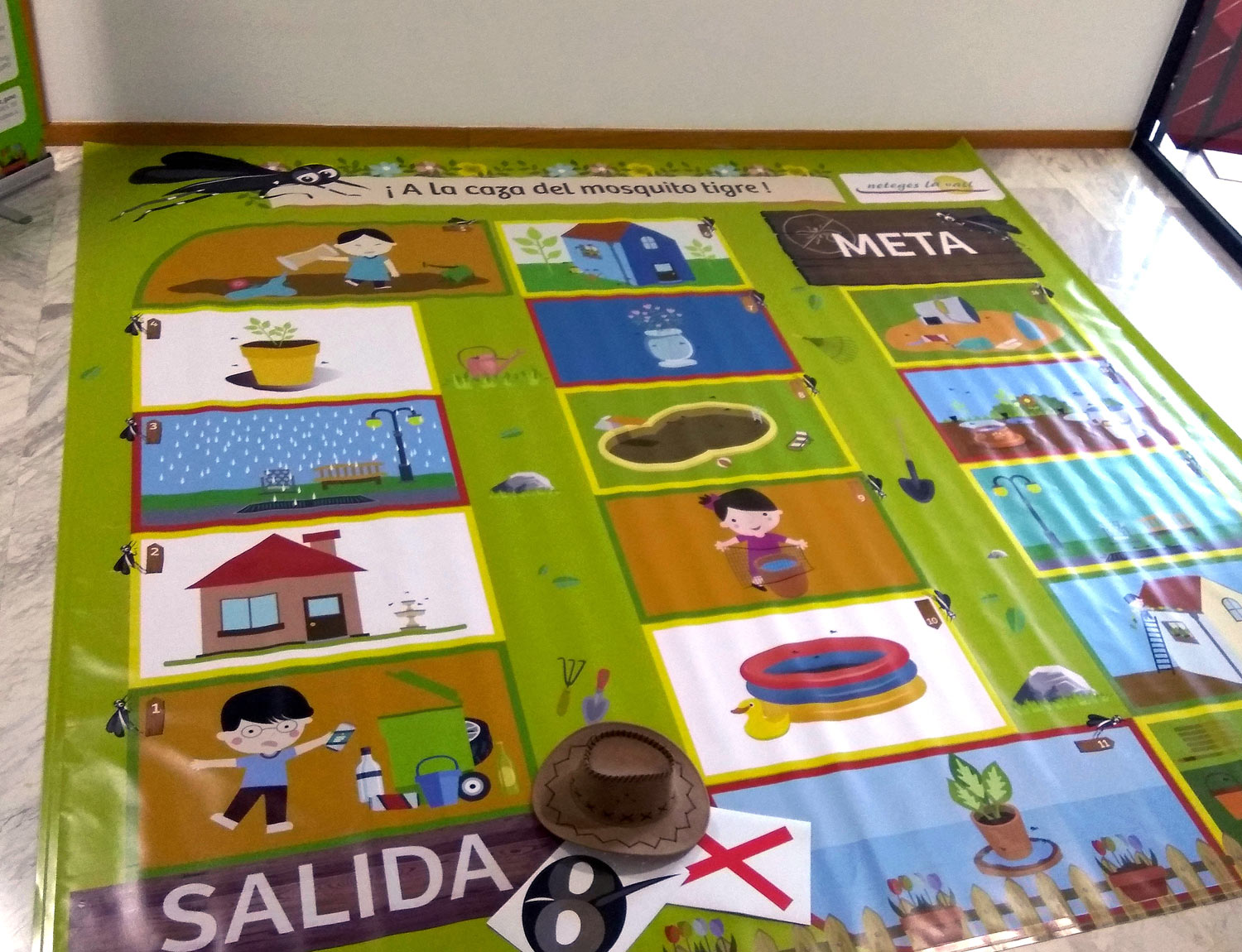 «Acompañamos el tablero de 3x3m (lona plástica muy resistente), con un rollup con las instrucciones, una batería de preguntas sobre el mosquito tigre, dados gigantes de espuma, gorro, careta y aspas rojas. Además se identifica con el logo de la empresa de control de plagas o el logo del organismo para el que se realizan las charlas o ambos. De momento lo tenemos disponible en castellano y valenciano pero se puede traducir a cualquier idioma.»