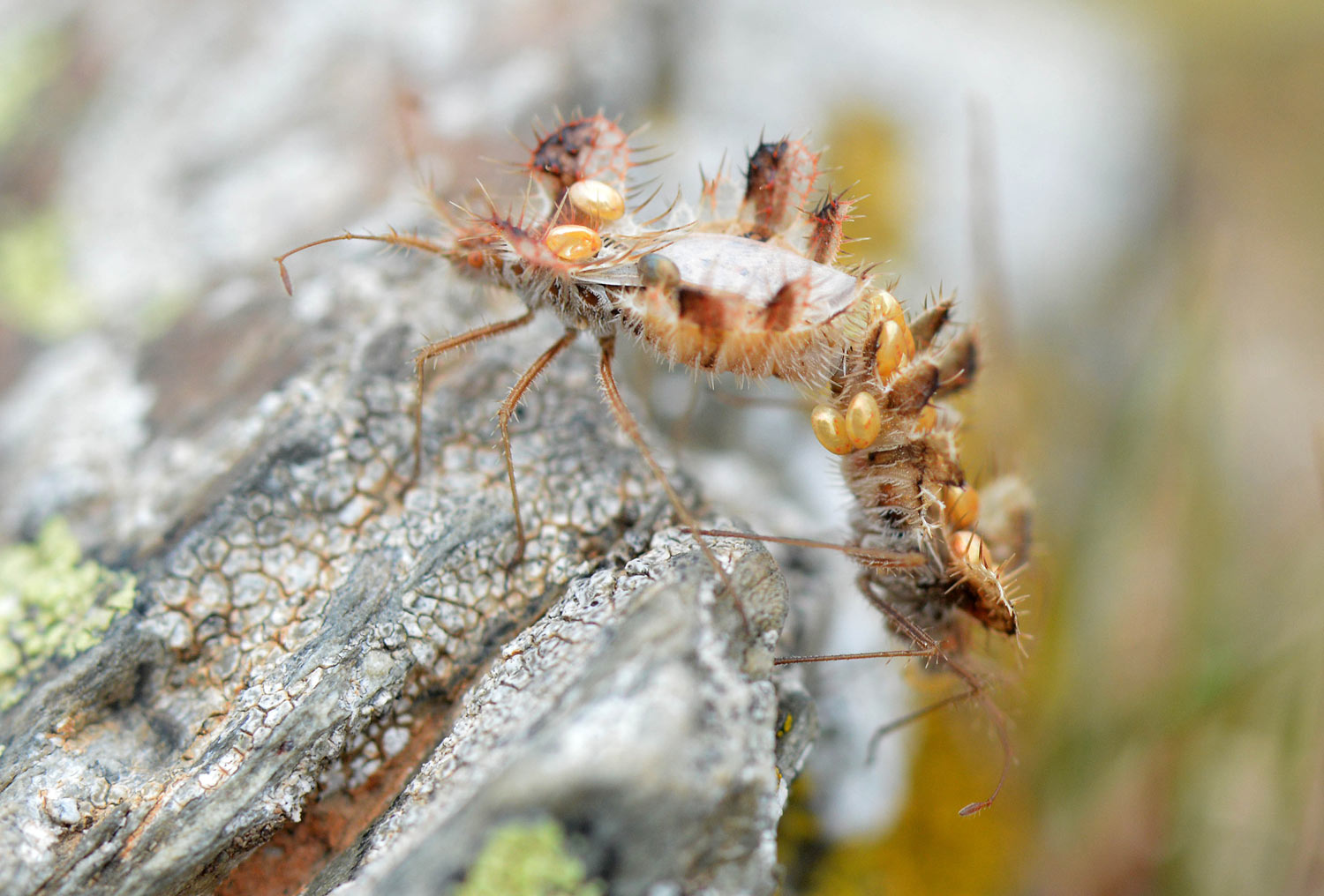 Paseando ayer por el Pla de la Calma en el Montseny, a unos 1.250 metros de altitud, encontré una pareja de chinches realizando la cópula. Como se puede ver, se trata de chinches bien curiosas e interesantes. Han evolucionado hacia un aspecto de forma y color que pasan bastante desapercibidas vistas de lejos. Porque, bien es cierto, que si las miramos de cerca son extraordinarias.