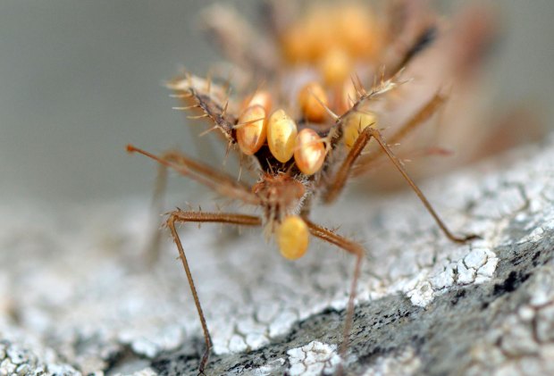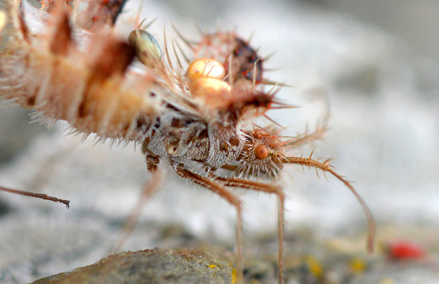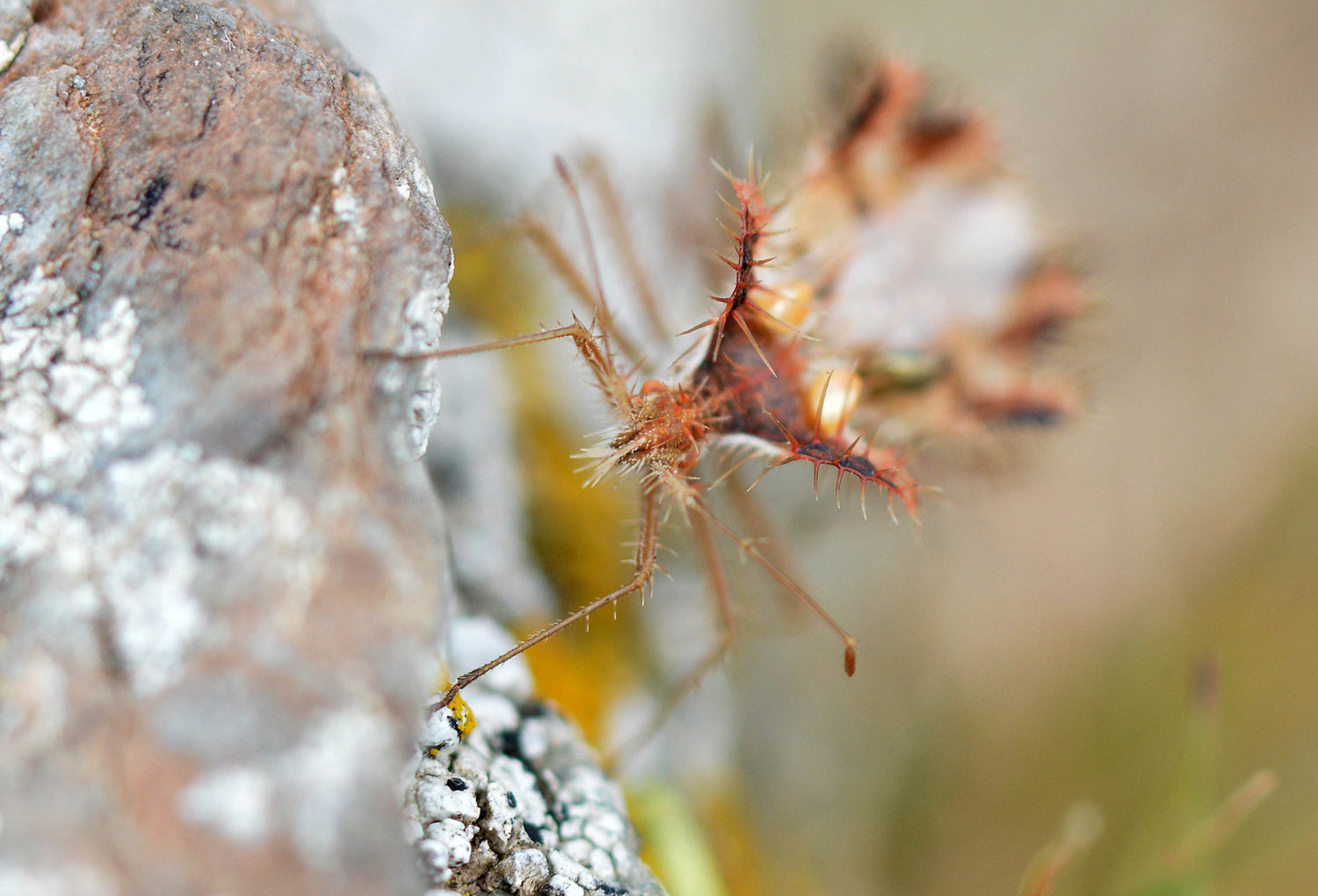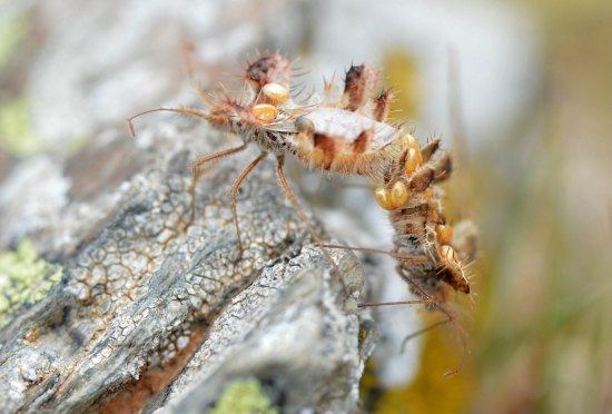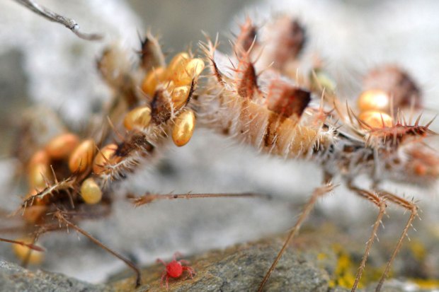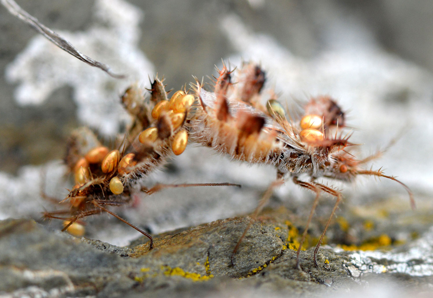 Vistas las imágenes, creo que el macho es el ejemplar de color marrón, ya que tiene más huevos. Incluso una hembra le ha colocado uno en la base de la antena. La hembra es de color rojo y solo tiene tres huevos sobre su espalda. Me pregunto cómo han llegado hasta su dorso. Es posible que otra hembra se los haya adosado. Porque, de no ser así, no entiendo cómo ella misma se los ha colocado. Y también es posible que el macho transporte huevos de más de una hembra. En el momento en que tomé las fotografías, ambos sexos estaban bien amarrados.