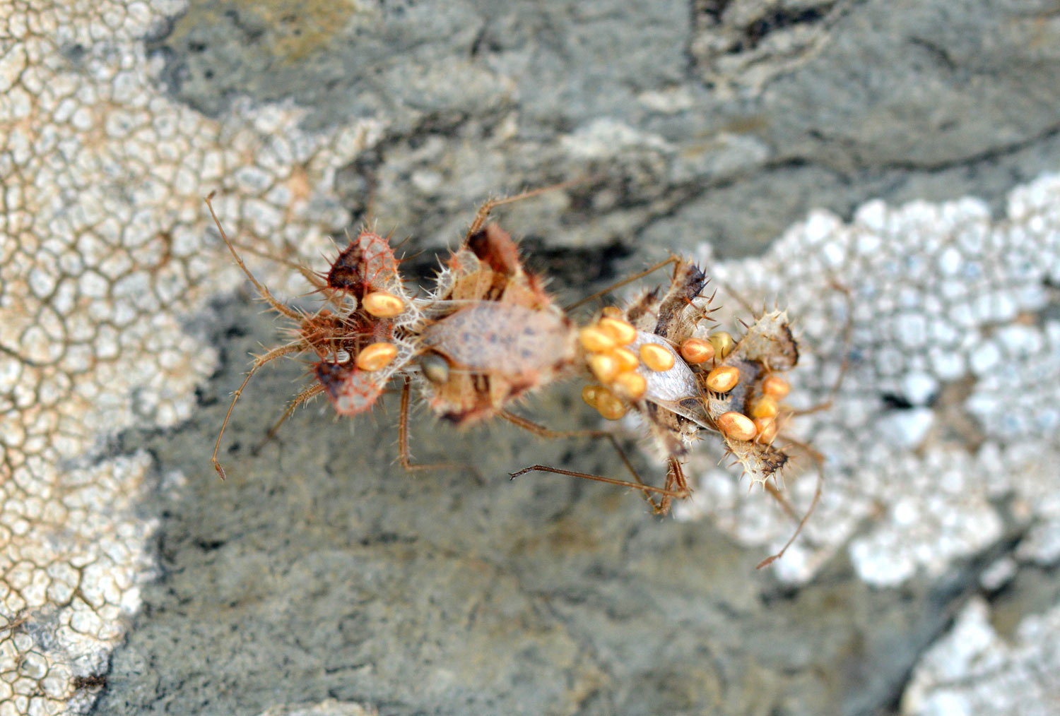 Esta pareja de chinches pertenecen a la especie Phyllomorpha laciniata, hemíptero de la famila Coreidae. Miden alrededor de 10 mm. Y según los manuales, su ciclo de vida está ligado a la presencia de planta llamada sanguinaria (Paronychia spp), la cual se desarrolla en lugares con mucha insolación. Pero además de su aspecto, un detalle muy interesante es que el macho se hace cargo de los huevos. La hembra copula con varios machos y deposita sus huevos sobre sus espaldas. Como se puede ver en las imágenes, los huevos son ovalados de color dorado. Pero también se puede ver que estos huevos se encuentran sobre ambos sexos.