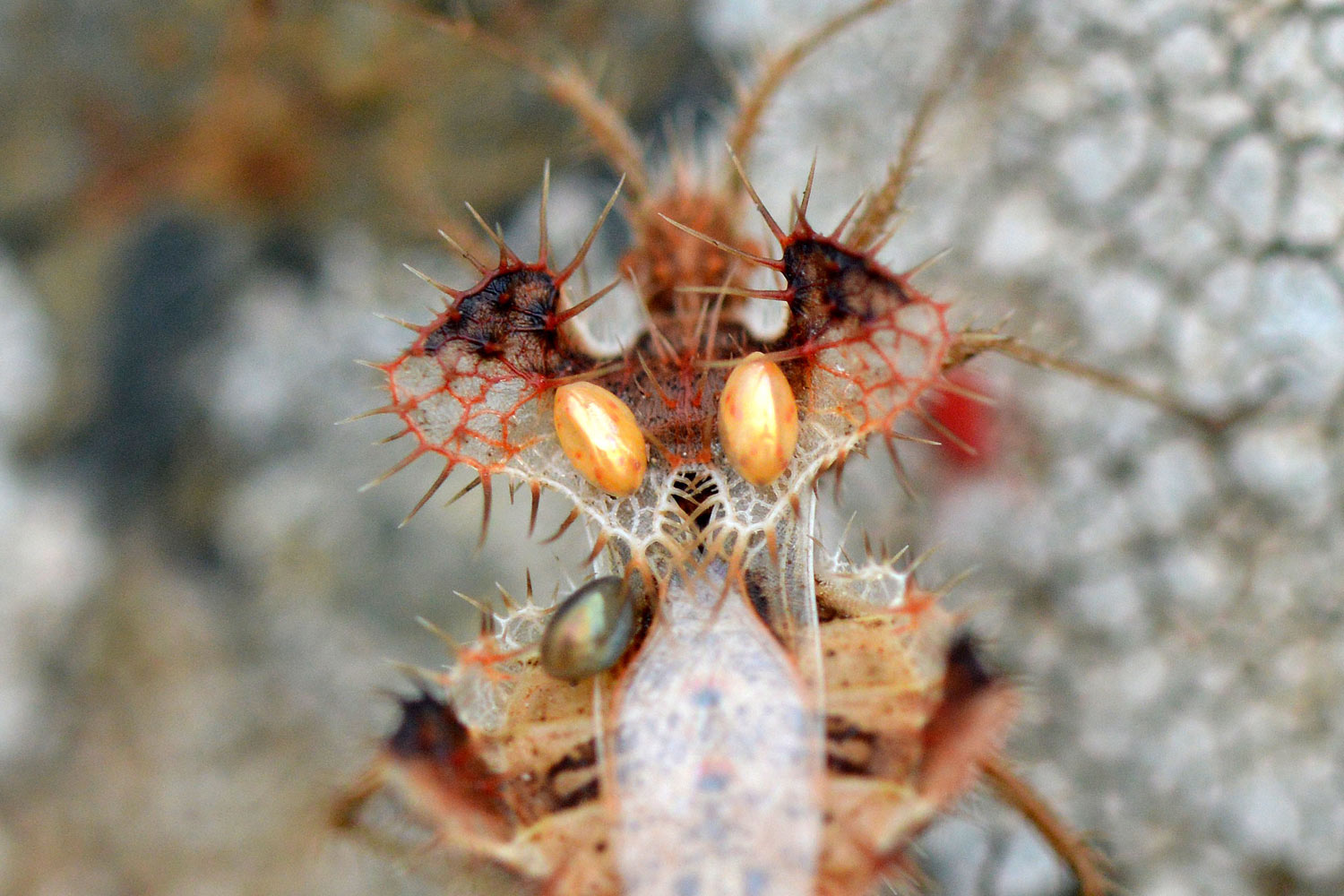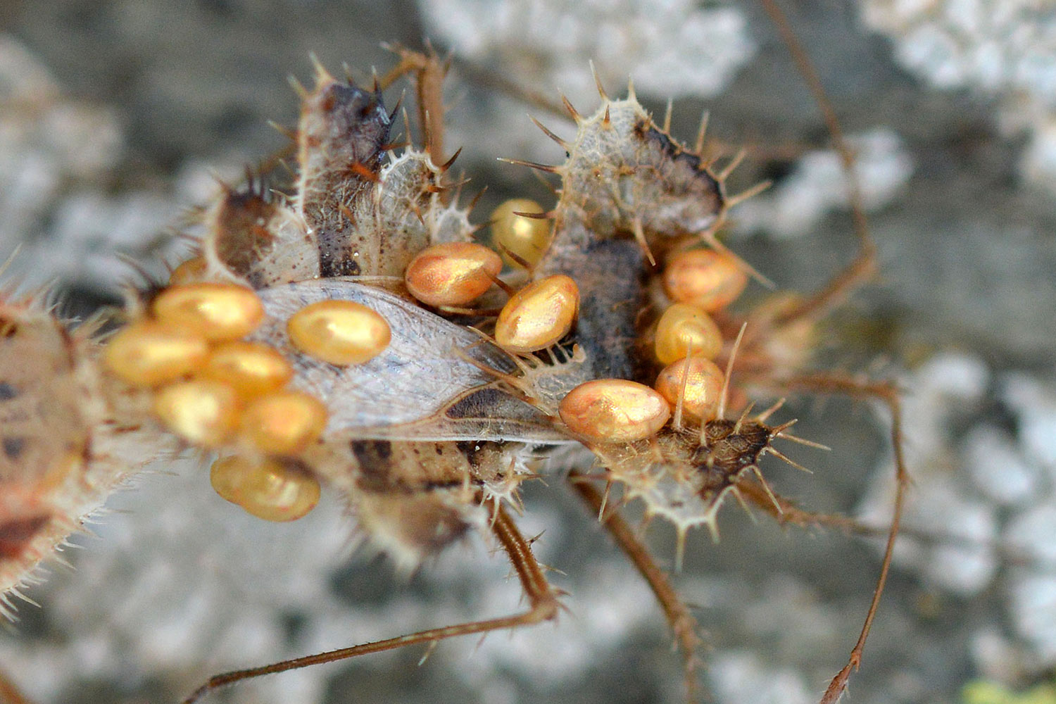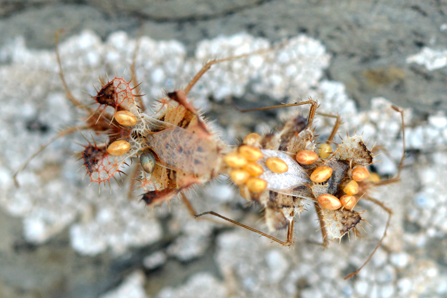 Respecto a lo que comentas de la hembra, es probable que, debido a la espinosidad corporal, los huevos que lleva sobre su lomo se hayan adherido de manera accidental.