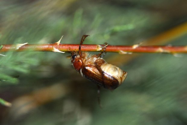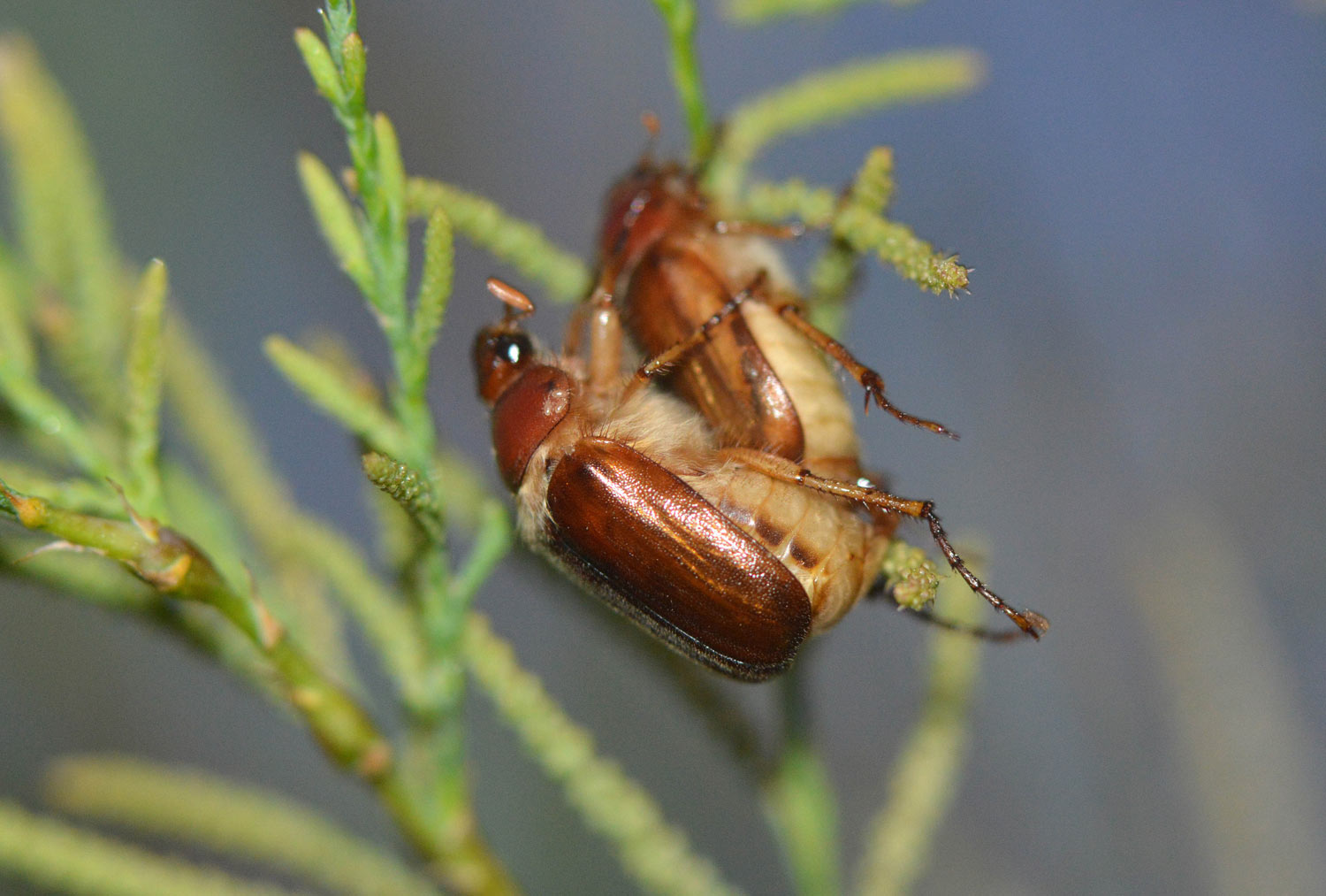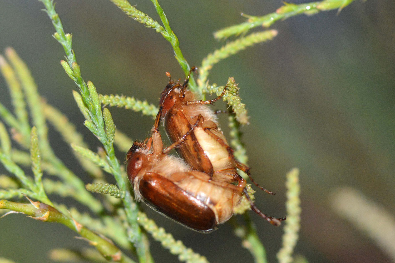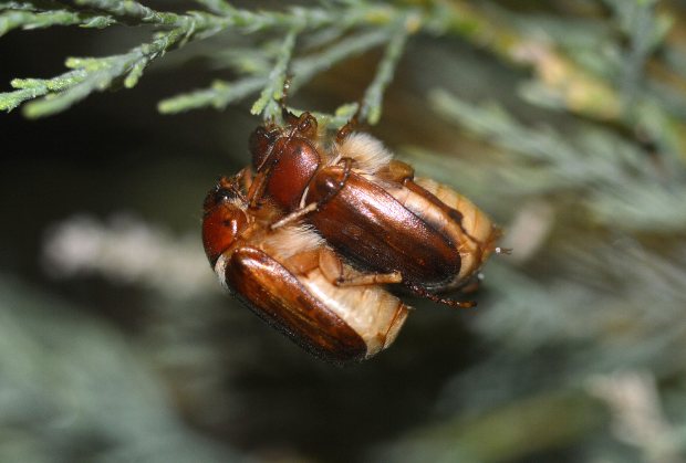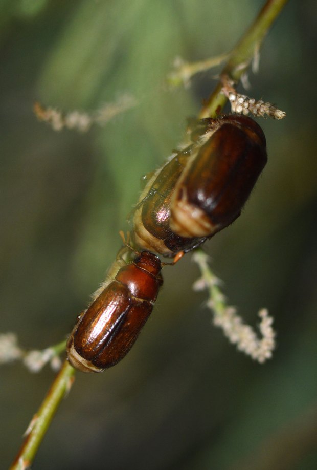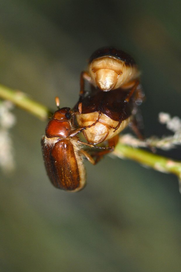 Este montículo está cuidado por los servicios de jardinería del municipio para que crezca tan solo la hierba. Es, por tanto, un lugar ideal para que en el suelo se desarrollen las larvas de estos coleópteros. Esto lo saben quienes cuidan el césped con esmero, ya que los escarabajos de junio y otros escarabeidos (Scarabaeidae) encuentran en este ambiente húmedo y con abundantes raíces tiernas su particular paraíso. Llevan, por tanto, una vida oculta bajo el suelo. Y cuando llega esta época emergen los imagos para realizar la cópula y reproducirse. Pude observar con detalle este momento. Con el sol desaparecido, cuando empezó la luz a flaquear, aparecieron los escarabajos volando alrededor del arbusto. Las hembras buscando un lugar donde posarse y los machos, con sus antenas más grandes, guiados por las feromonas. Al aparecer las penumbras de la noche, las hembras se posaron sobre las ramas a la espera de que un macho llegara y se acoplara. No se demoró mucho la cosa, porque rápido los machos se abalanzaron sobre las hembras agarrándose a su espalda.