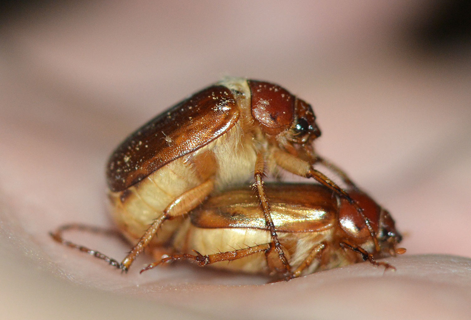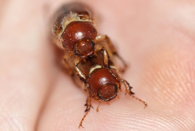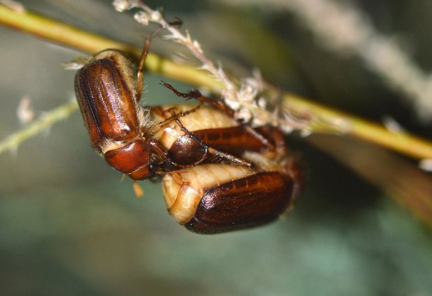 Fig 10. Pareja de escarabajos de junio (Amphimallon) molestado por un tercero en discordia./ C. Pradera 06-2017