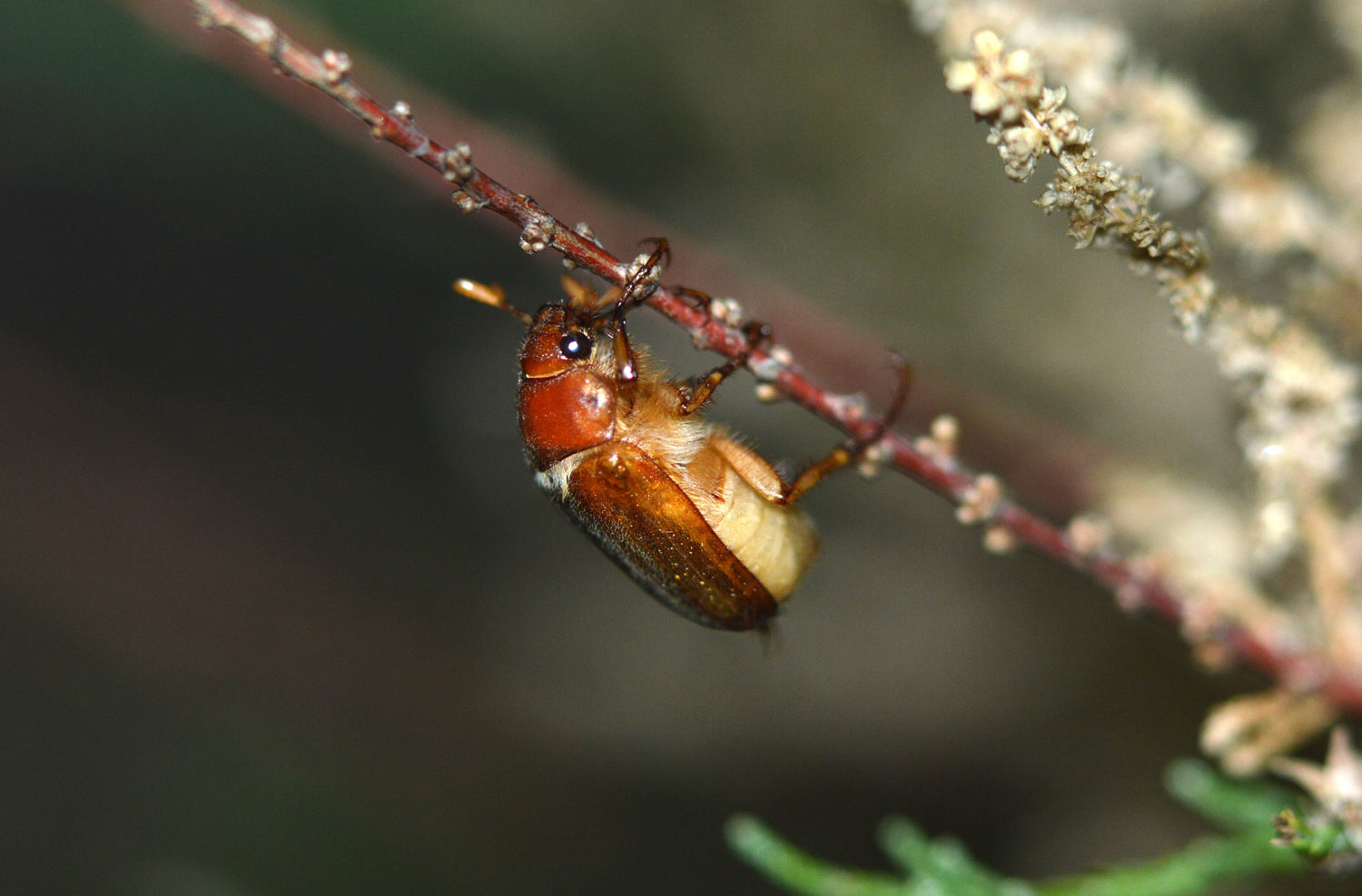 En esta época del año, en la zona donde resido, se está dando la cópula de los escarabajos de junio (Amphimallon) [1]. Para que puedan completar su ciclo, es necesario que se junten las hembras y los machos. Y esto ocurre al anochecer. En la imagen número 1, se puede ver un arbusto de unos dos metros de alto donde se está produciendo el encuentro durante estos días. Está ubicado en un montículo frente al mar en el término municipal de Montgat. Al fondo se puede ver la silueta de Barcelona.
