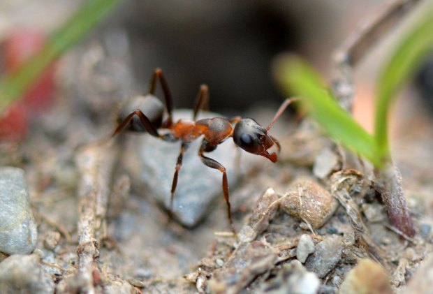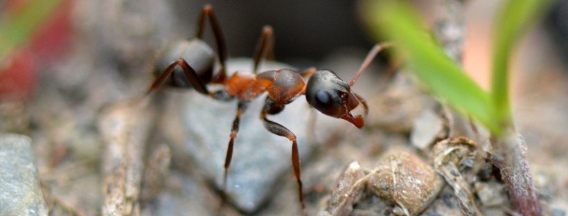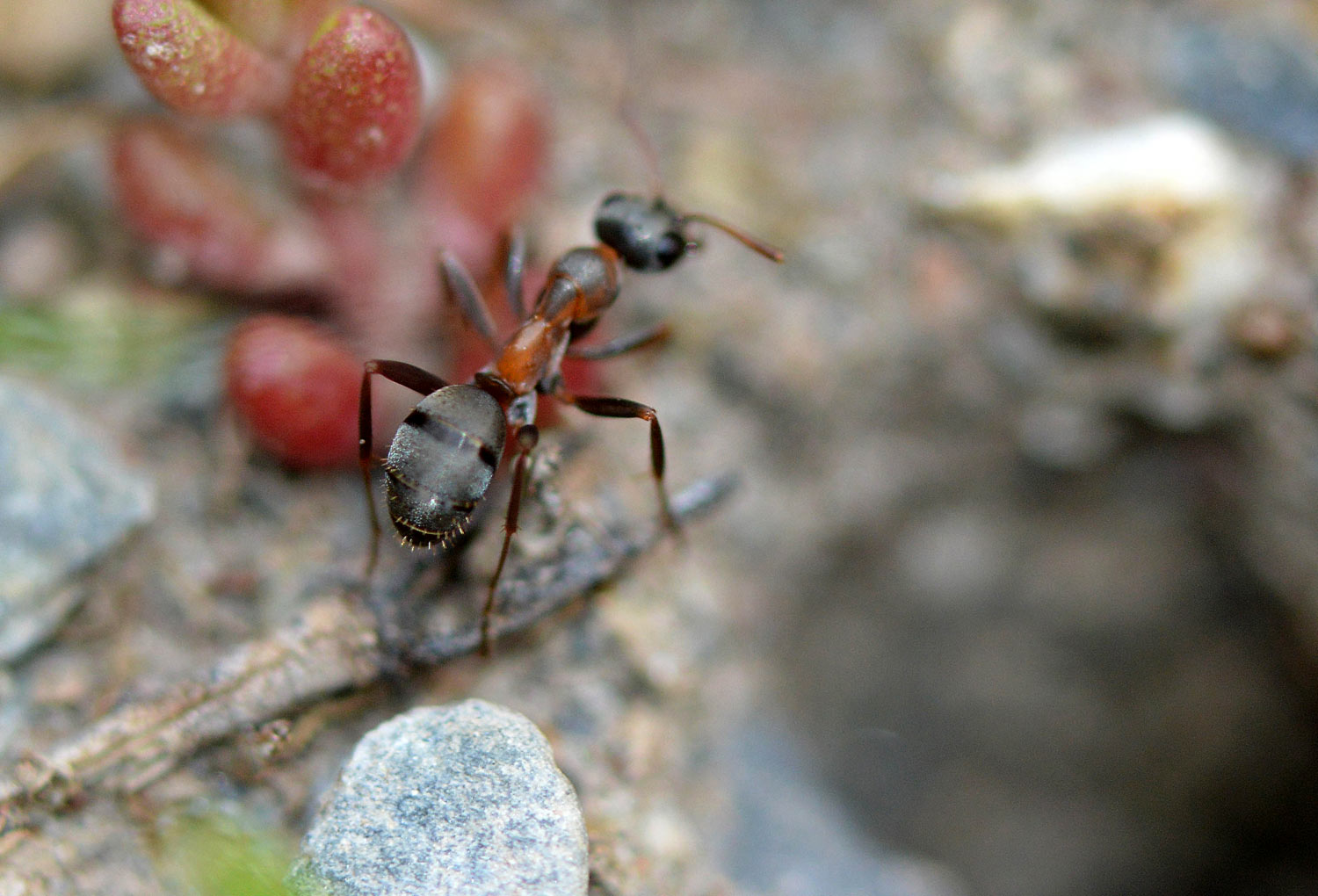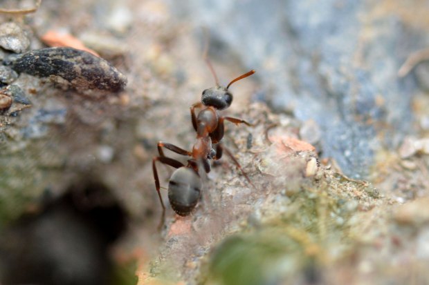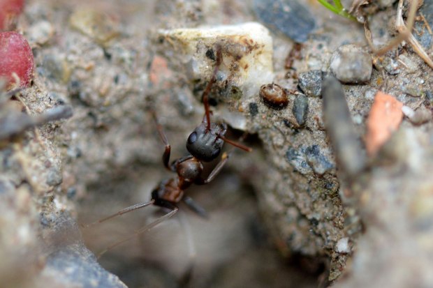 Encontré una interesante hormiga en un erial con vegetación muy baja a la salida de Tavascán, población del Pallars Sobirà (Lleida) a 1.100 m de altitud. Como se puede ver, las obreras de Formica cunicularia tienen unos ojos muy grandes, y esto significa que tienen una buena vista. Lo pude comprobar, porque cuando me acercaba, corrían a esconderse debajo de una planta, ramita o piedra. Para poderlas fotografiar, me aproximé y esperé a que cogieran confianza. No todas las especies de hormigas tienen tan buena vista como para verte. Suele pasar con las especies de gran tamaño. Las pequeñas, simplemente te ignoran, no existes en su mundo. He observado que algunas hormigas grandes tienen una táctica de escapismo interesante. Si están en una planta y, al aproximarte, presienten que eres una amenaza, se dejan caer al suelo.