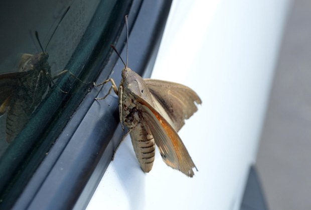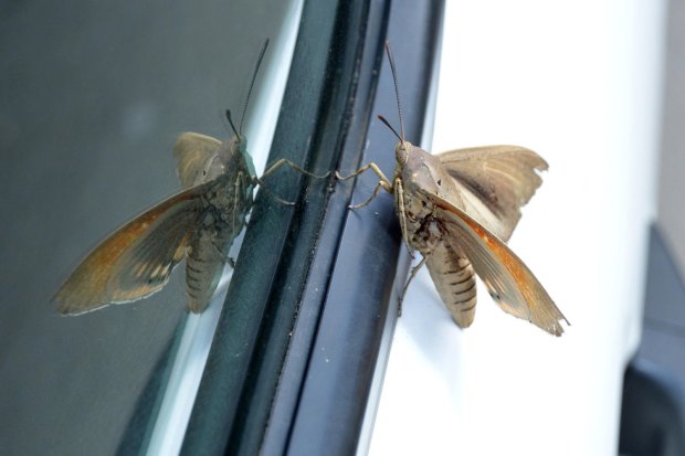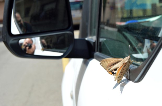 Fig 1. Ejemplar de Paysandisia archon sobre la furgoneta de trabajo./ C. Pradera 06-2017