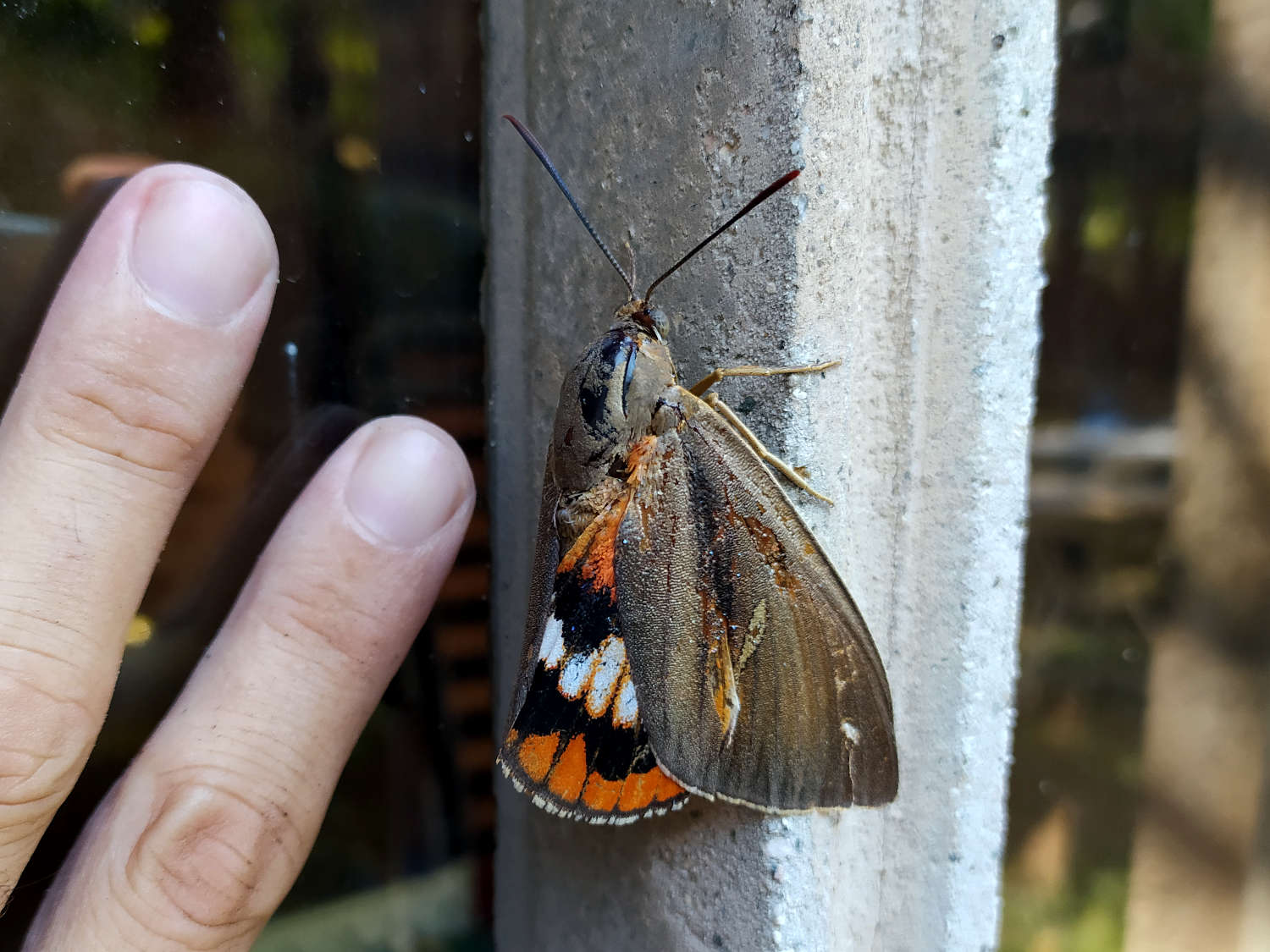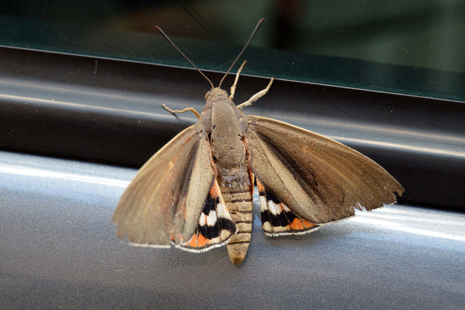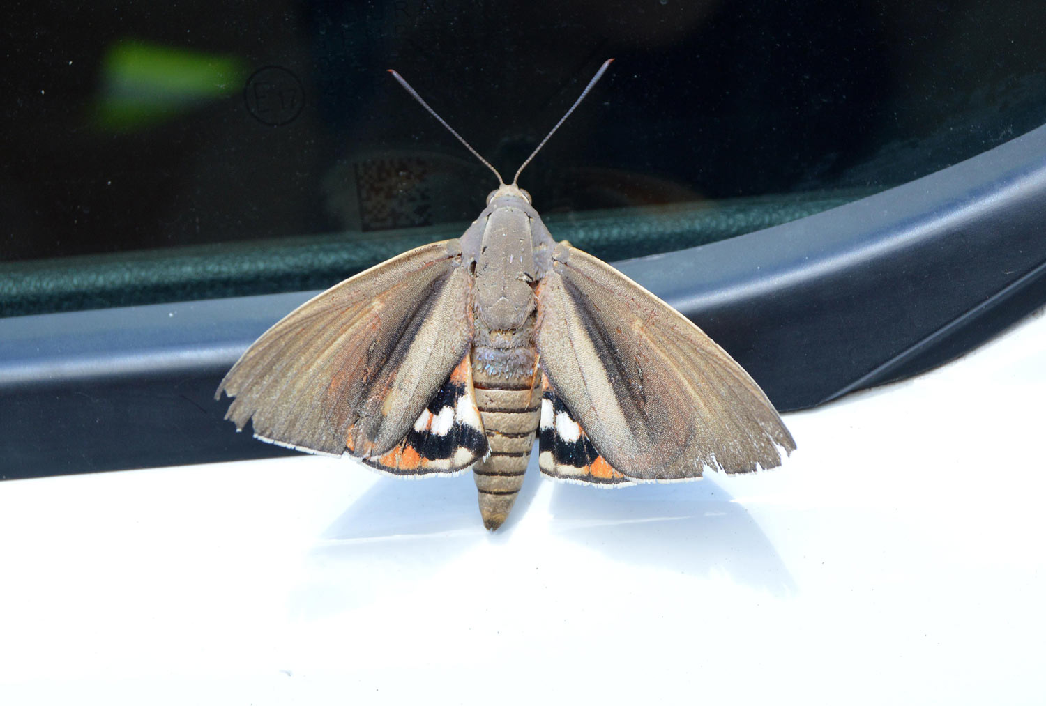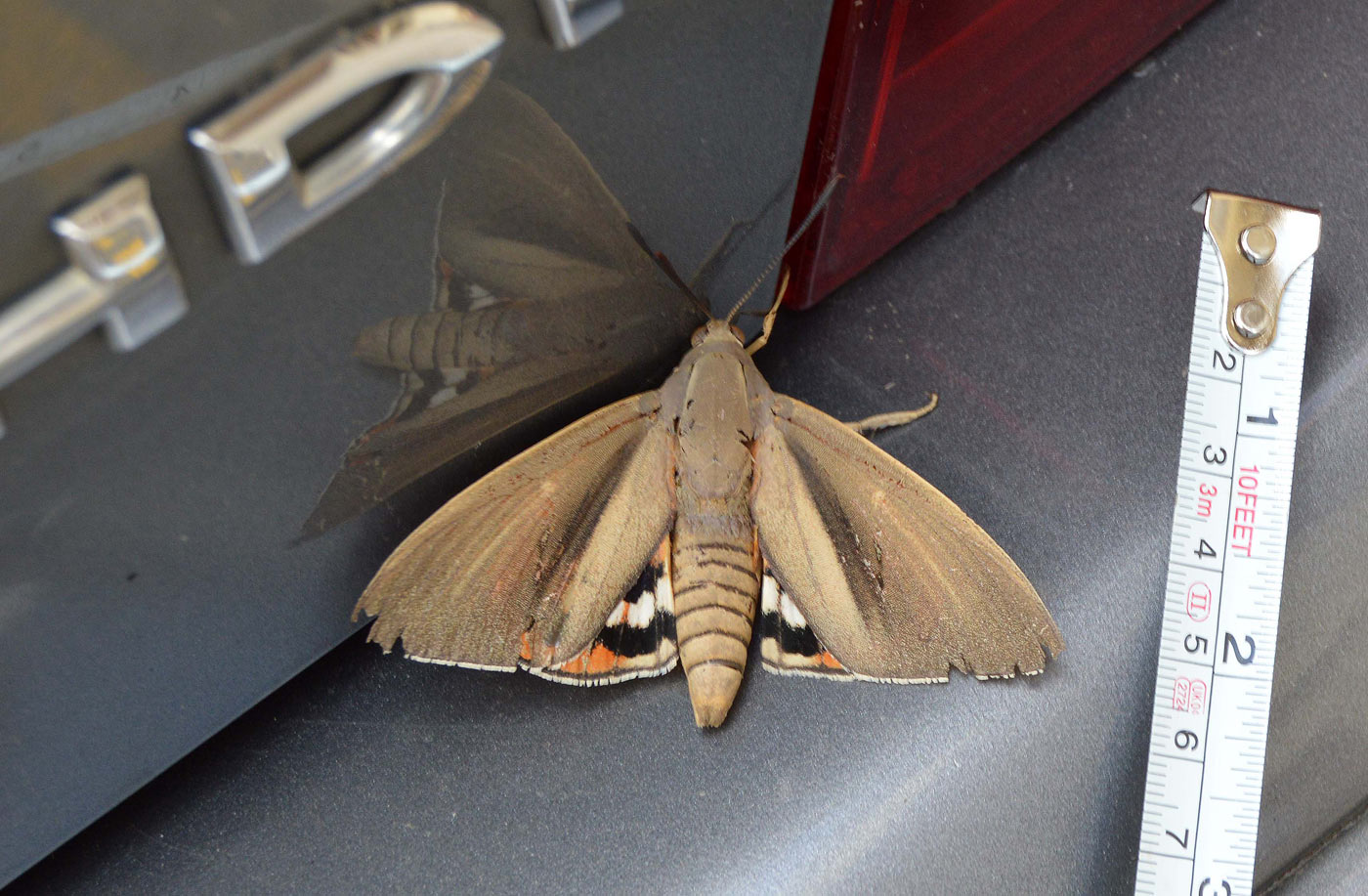 El pasado viernes por la mañana estuve realizando un tratamiento en Canovelles (Barcelona) contra chinches de cama (Cimex lectularius). Al regresar a la furgoneta de trabajo, me encontré sobre la puerta del conductor un gran lepidóptero (figura 1). Fui a por la cámara y tomé unas fotografías. Era una mariposa grande e interesante que no había visto antes y que no reconocía como autóctona. Las alas anteriores eran de colores apagados, marrón y gris, mientras que las posteriores eran de colores vivaces, rojo y naranja con franjas negras. Con la ayuda de un metro (figuras 8 y 9) pude constatar que tenía un cuerpo de unos 50 mm de largo y que la envergadura alar era de unos 80 mm. El ejemplar se veía viejo. Estaba desgastado. Tenía las alas deterioradas y le faltaban escamas por todo el cuerpo.