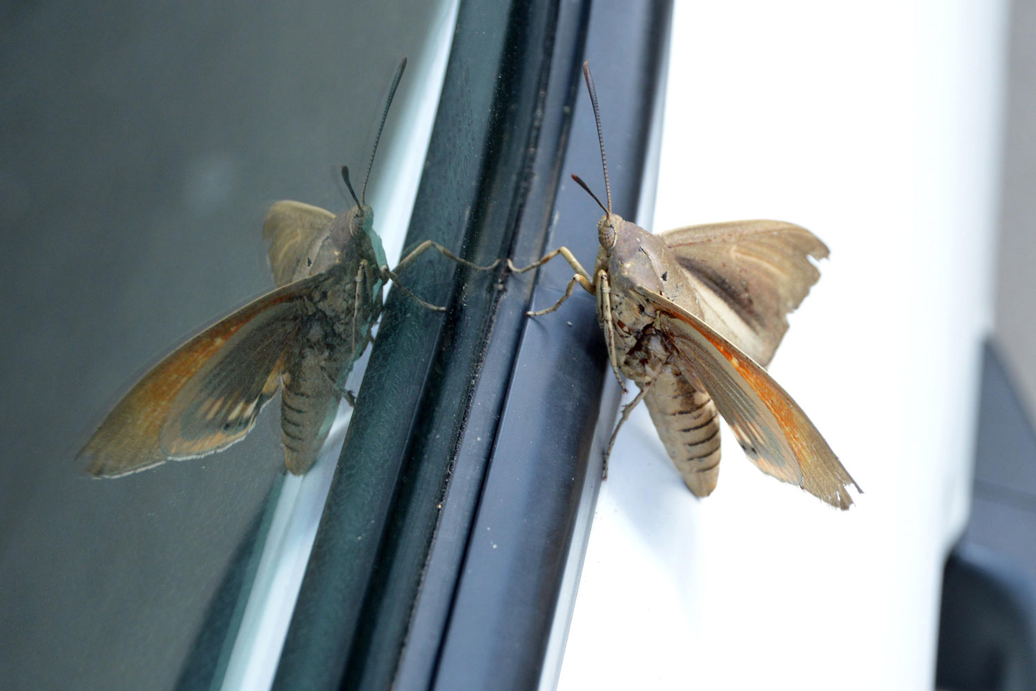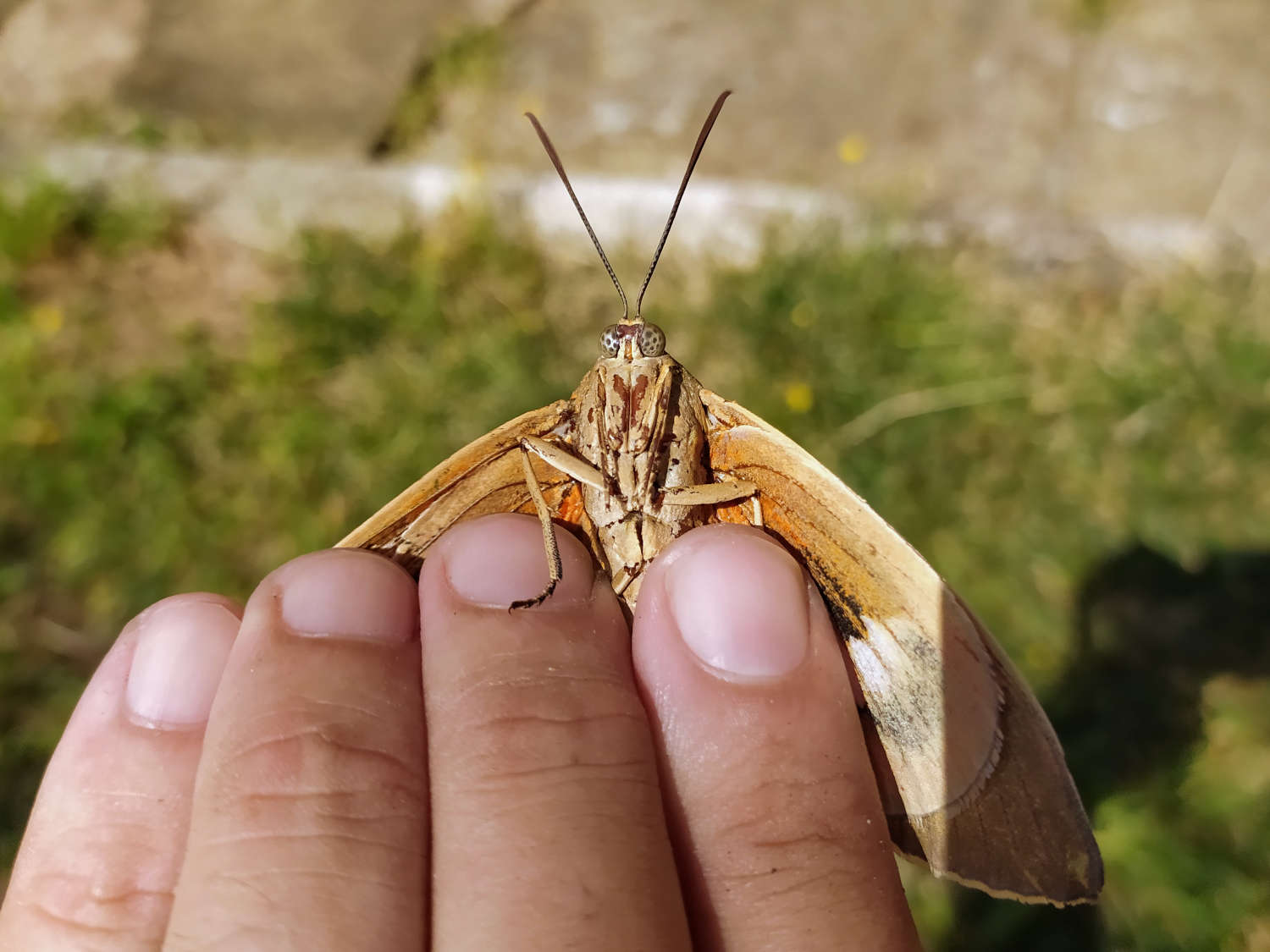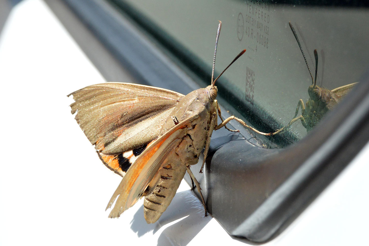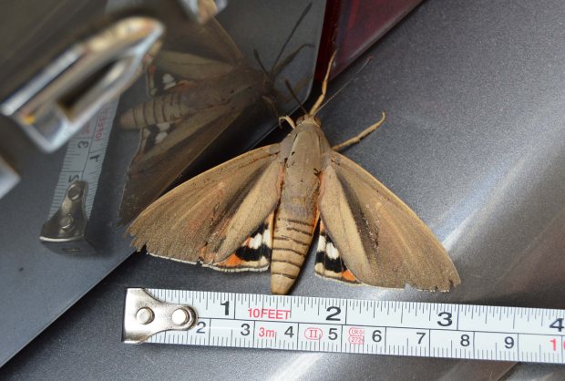 El pasado viernes por la mañana estuve realizando un tratamiento en Canovelles (Barcelona) contra chinches de cama (Cimex lectularius). Al regresar a la furgoneta de trabajo, me encontré sobre la puerta del conductor un gran lepidóptero (figura 1). Fui a por la cámara y tomé unas fotografías. Era una mariposa grande e interesante que no había visto antes y que no reconocía como autóctona. Las alas anteriores eran de colores apagados, marrón y gris, mientras que las posteriores eran de colores vivaces, rojo y naranja con franjas negras. Con la ayuda de un metro (figuras 8 y 9) pude constatar que tenía un cuerpo de unos 50 mm de largo y que la envergadura alar era de unos 80 mm. El ejemplar se veía viejo. Estaba desgastado. Tenía las alas deterioradas y le faltaban escamas por todo el cuerpo.