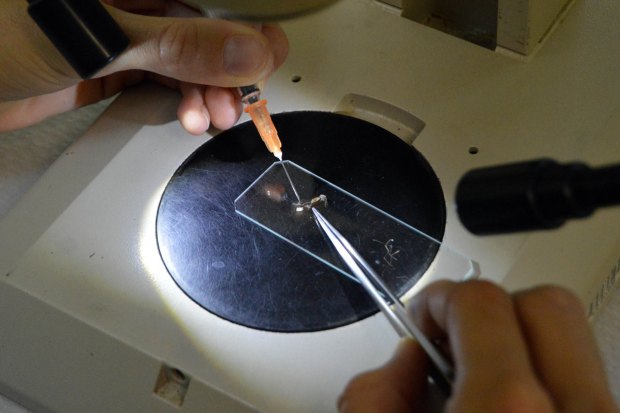 Fig 2. Tuvimos que realizar la disección de una hembra de mosquito. El objetivo era difícil. Había que extraer el contenido del abdomen para ver el aparato reproductor con el fin de saber si la hembra había iniciado el ciclo gonotrófico. Y para rizar el rizo, saber si lo había realizado antes. Todo ello me pareció, así de repente, difícil./ C. Pradera 07-2017
