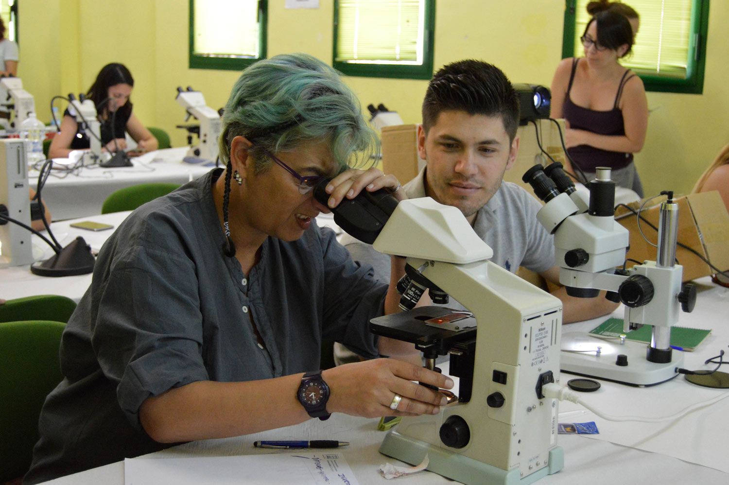 Fig 1. Miércoles 12 de julio de 2017, tercer día del curso sobre Entomología Sanitaria y Control de Vectores de la Universidad de Zaragoza celebrado en Grañén (Huesca). Tuvimos una clase extraordinaria en el laboratorio a cargo de Rosario Melero Alcíbar. Esta especialista nos introdujo en un mundo que desconocía, en el de las hembras de culícido nulíparas y paras./ C. Pradera 07-2017
