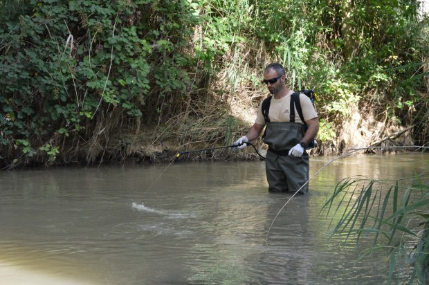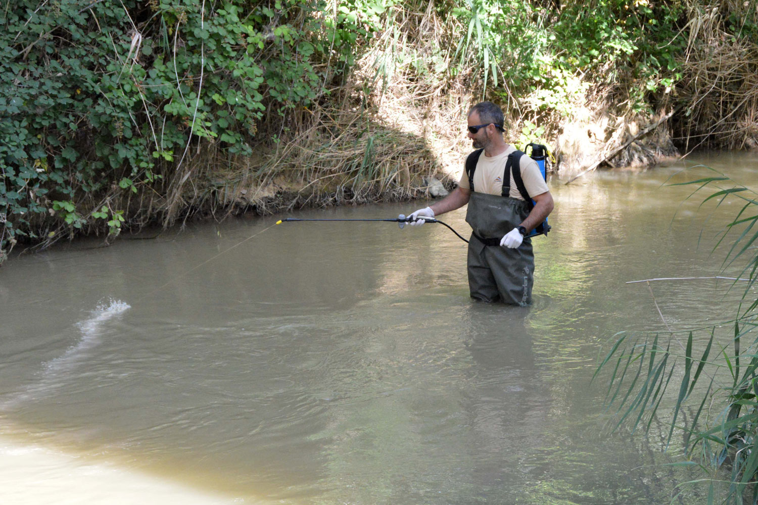 Fig 9. Uno de los técnicos se colocó en el centro del río y aplicó durante 10 minutos el caldo a base de Vectobac 12AS, cuya materia activa es Bacillus thuringensis subesp. Israelensis./ C. Pradera 07-2017