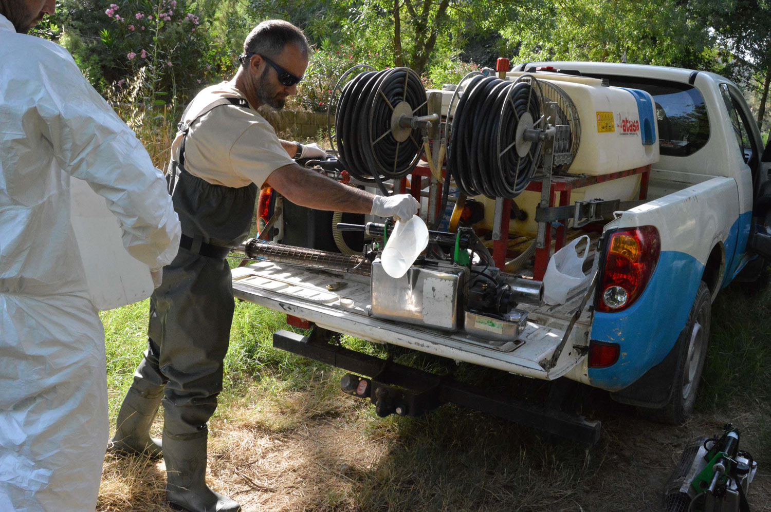 Fig 3. El tratamiento fue realizado por personal de Monegros Servicios Medioambientales SL, empresa pública dependiente de la Comarca de los Monegros y a cuyo cargo se encuentra Ángela Martínez Gavín, Ingeniero Técnico Agrícola./ C. Pradera 07-2017