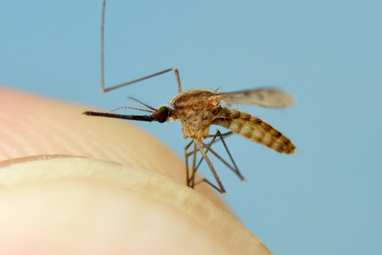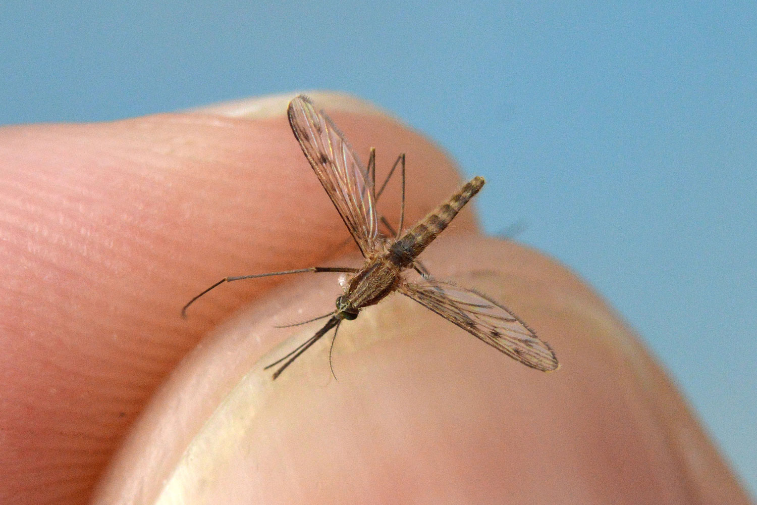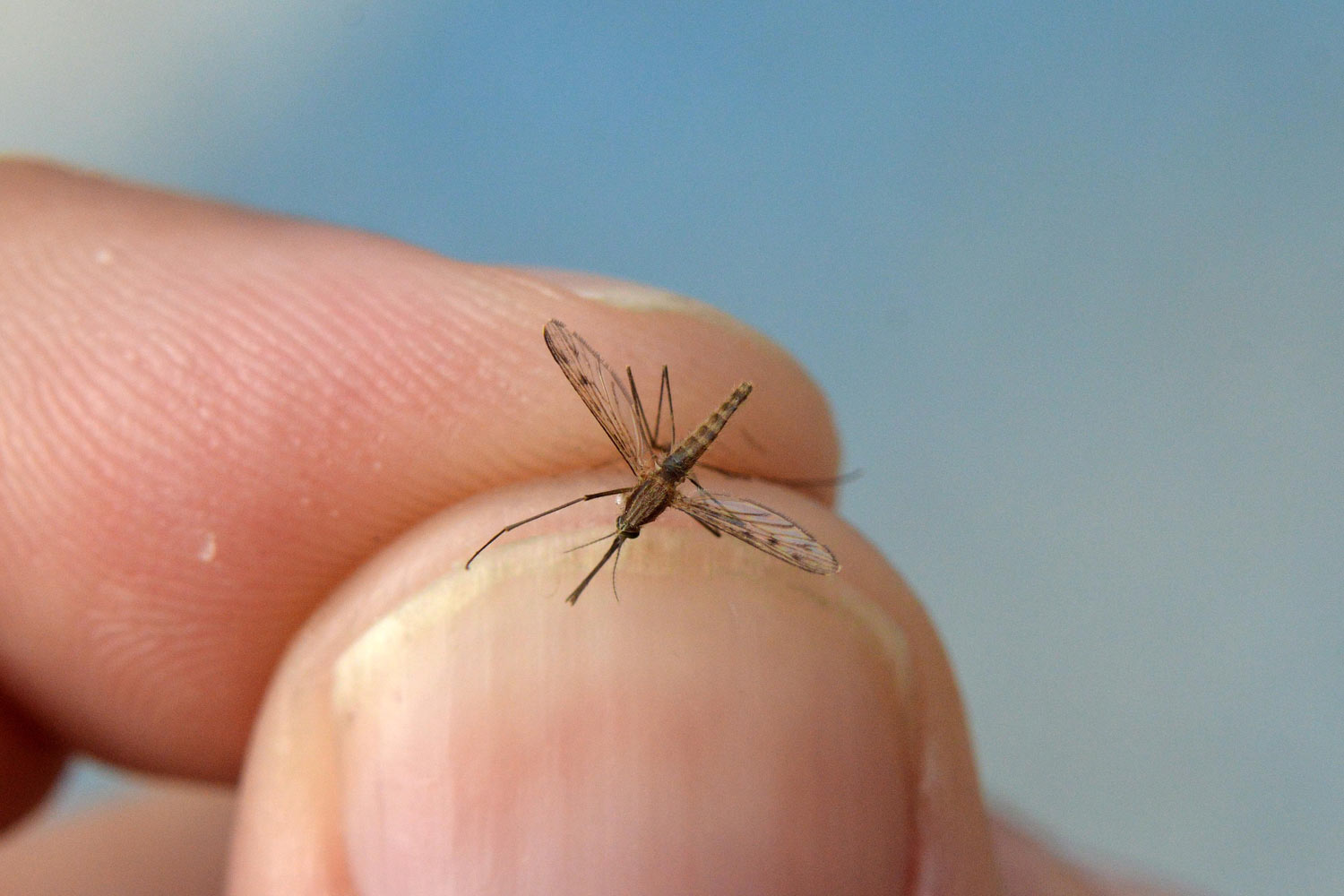 Una de las cosas que me propuse durante mi estancia en esa comarca fue la de encontrar algún mosquito del género Anopheles. Para ello realicé una búsqueda en un campo de arroz, aunque sin éxito. En la imagen número 1, se puede ver una panorámica de campos de arroz. Y en la imagen número 2, se puede ver la situación de estos campos en un mapa. Tenía esperanza por dos razones. Una porque allí hay cultivos propicios como campos de arroz que se encuentran en dos poblaciones aledañas, en San Juan de Flumen y en la Cartuja de los Monegros. Y otra porque en esta segunda población se dio en 2010 por vez primera desde hacía casi cuatro décadas el primer caso de transmisión autóctona de paludismo en España [1]. Ahora bien, ¡cómo es la vida!, fui a buscar larvas y adultos de Anopheles y no los encontré. Pero, cuando no lo buscaba, una hembra llegó hasta mí. Maravilloso. El jueves 13 de julio, estaba sentado en la terraza de una cafetería a eso de las 9 de la mañana en Grañén, cuando un mosquito se acercó volando. Se aproximó sobre un compañero de curso con quien charlaba. Le dije que no se moviera. Y cuando se posó lo cacé con la mano derecha. Y luego rápido lo pasé a mi mano izquierda para poder tomar las fotografías que se pueden ver en esta entrada. Quedó un poco destrozado.