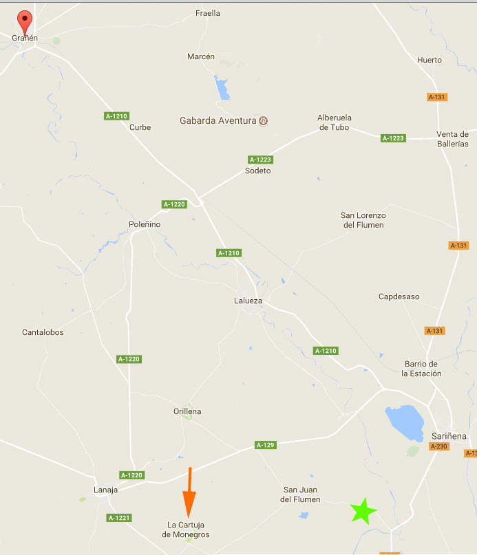 Fig 2. Situación de Grañén al norte. Y de la Cartuja de los Monegros al sur. En verde el campo de arroz donde hice un muestreo./ Google Earth