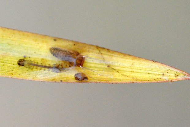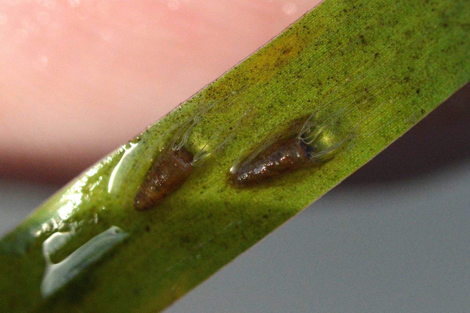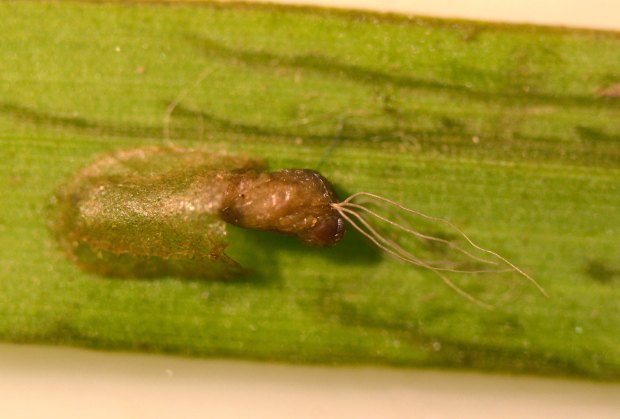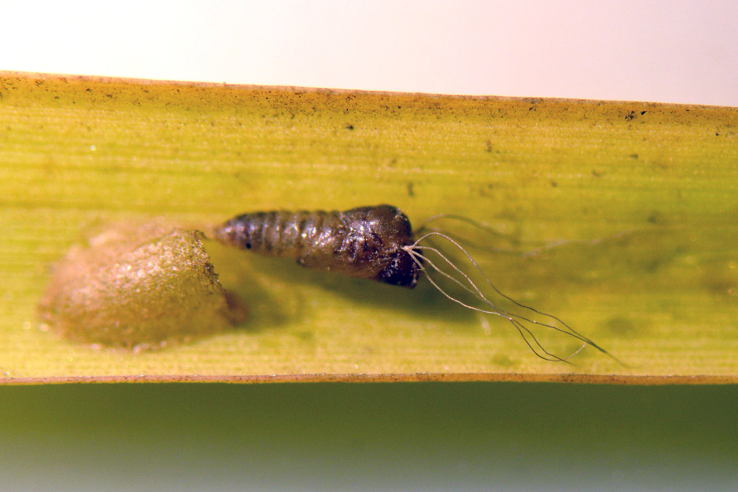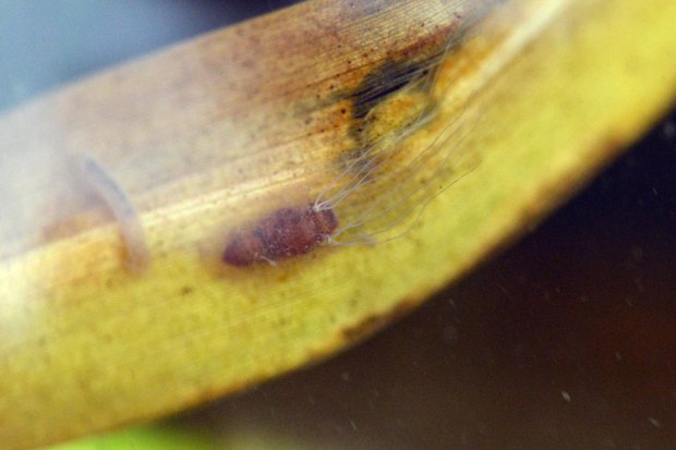 Pues bien, hace unos días hice mi primera salida. Y me fui a uno de sus afluentes, a la riera de Caldes. Corría muy poca agua. Y por donde me moví, a la altura de la población de Palau-Solità i Plegamans con la de Polinyà, el terreno es más bien llano por lo que hay pocos puntos con una corriente suficiente como para que las larvas y pupas de simúlido puedan desarrollarse. Sin embargo, en algunos puntos el curso de agua se estrechaba y aceleraba. Y se podían ver larvas en muy pequeña cantidad. En un lugar donde la riera se estrechaba bastante y las plantas que crecían en la orilla se metían en el agua (figura 1), decidí plantarme y observar. Fijadas a los tallos y hojas sumergidas encontré larvas y pupas. Eso sí, en pequeño cantidad por el poco caudal de agua y la calidad de este tipo de sustrato. También pude apreciar, hasta donde llegan mis conocimientos, que todas las larvas y pupas parecían de la misma especie.