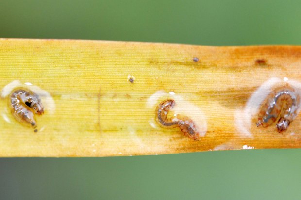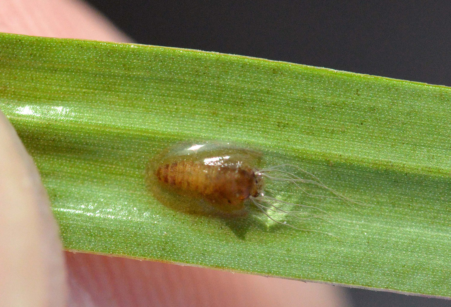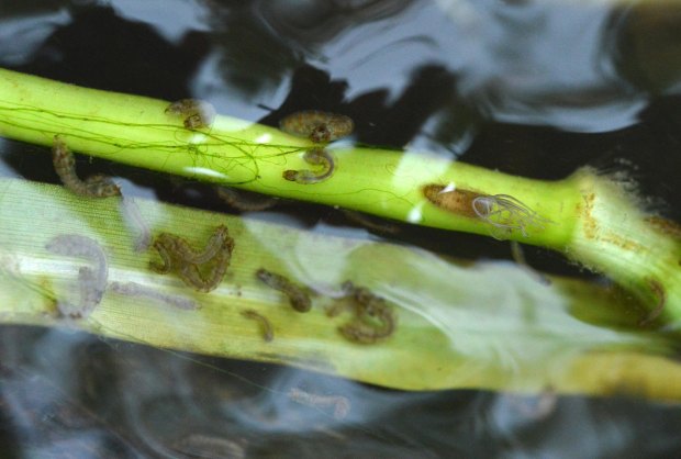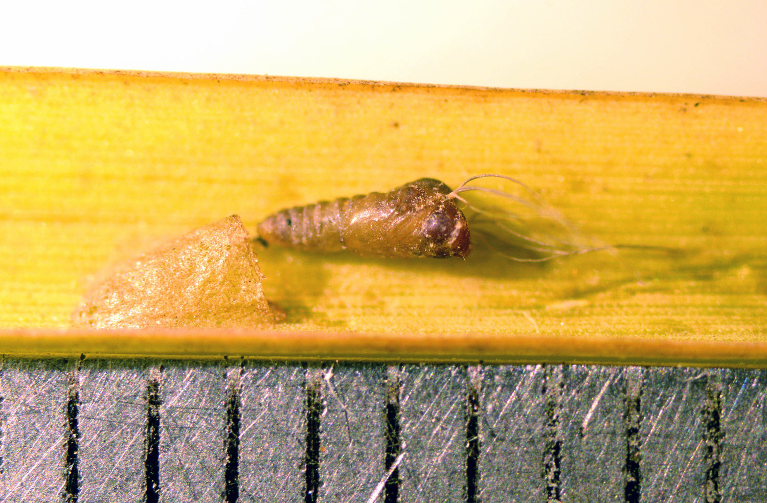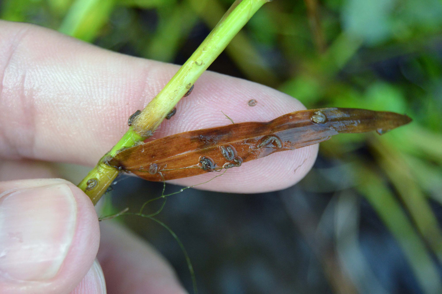 Pues bien, hace unos días hice mi primera salida. Y me fui a uno de sus afluentes, a la riera de Caldes. Corría muy poca agua. Y por donde me moví, a la altura de la población de Palau-Solità i Plegamans con la de Polinyà, el terreno es más bien llano por lo que hay pocos puntos con una corriente suficiente como para que las larvas y pupas de simúlido puedan desarrollarse. Sin embargo, en algunos puntos el curso de agua se estrechaba y aceleraba. Y se podían ver larvas en muy pequeña cantidad. En un lugar donde la riera se estrechaba bastante y las plantas que crecían en la orilla se metían en el agua (figura 1), decidí plantarme y observar. Fijadas a los tallos y hojas sumergidas encontré larvas y pupas. Eso sí, en pequeño cantidad por el poco caudal de agua y la calidad de este tipo de sustrato. También pude apreciar, hasta donde llegan mis conocimientos, que todas las larvas y pupas parecían de la misma especie.