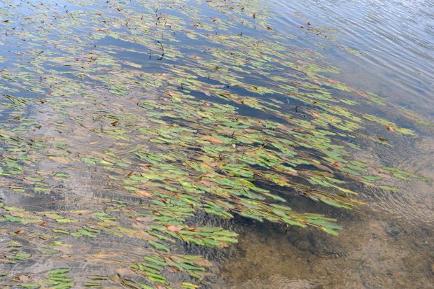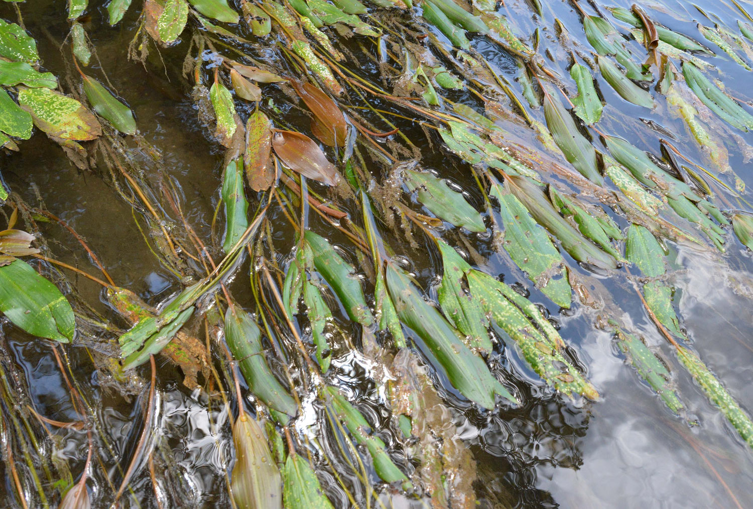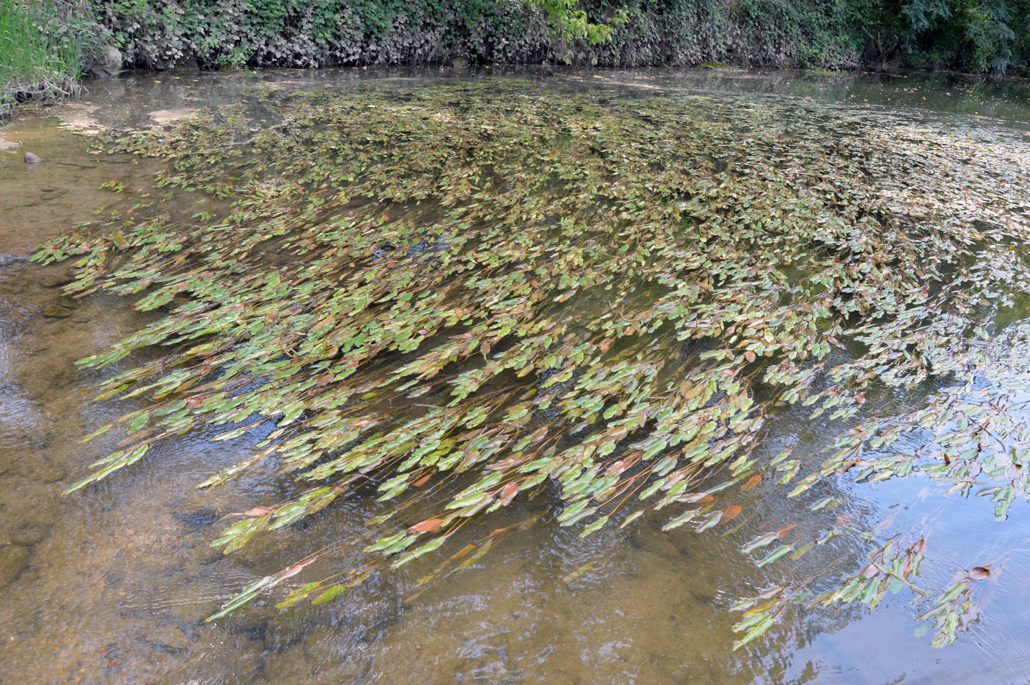 Fig 3. A un lado del río, en la parte superior del puente, crecían vigorosas plantas acuáticas de la especie Potamogeton nodosus. Se trata de un macrófito que emerge del agua y cuyas hojas se encuentran flotando sobre la superficie. Esta planta, como otros macrófitos, puede actuar como sustrato para que las larvas y pupas de simúlido se fijen a ella./ Desinsectador 08-2017