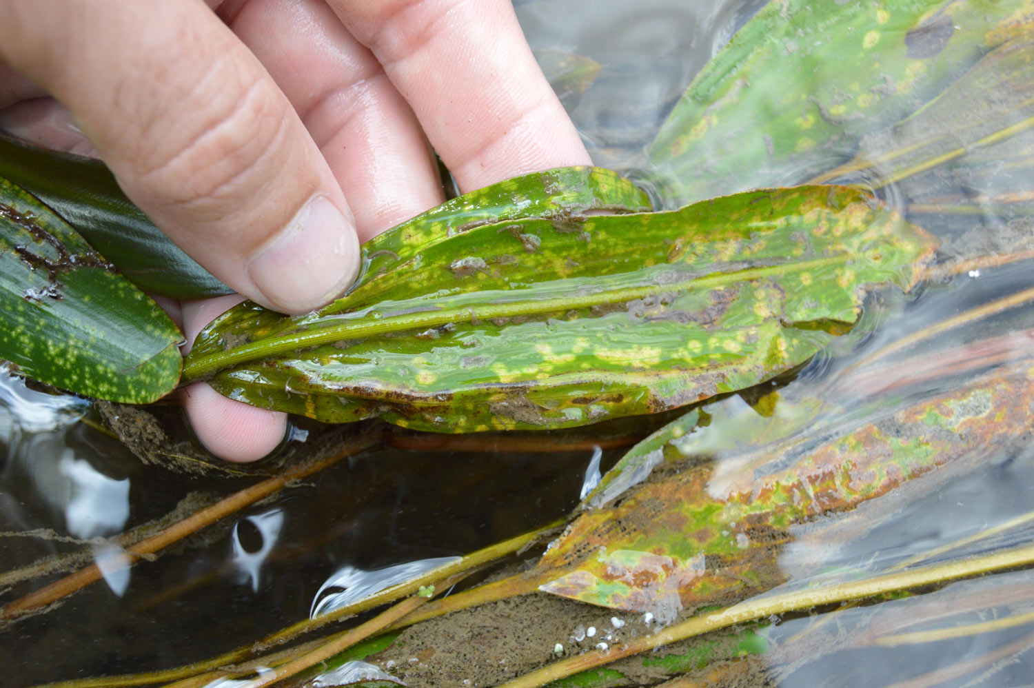 Fig 4. Esta planta acuática no parecía el lugar ideal para que las larvas de simúlido se desarrollaran en gran número. Existen otros dos macrófitos que sí son buenos sustratos como Potamogeton pectinatus y Myriophyllum spicatum. Pero yo no los vi durante la mañana que anduve buscando por la zona./ Desinsectador 08-2017