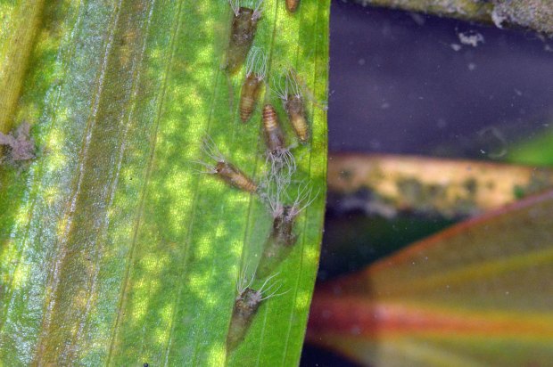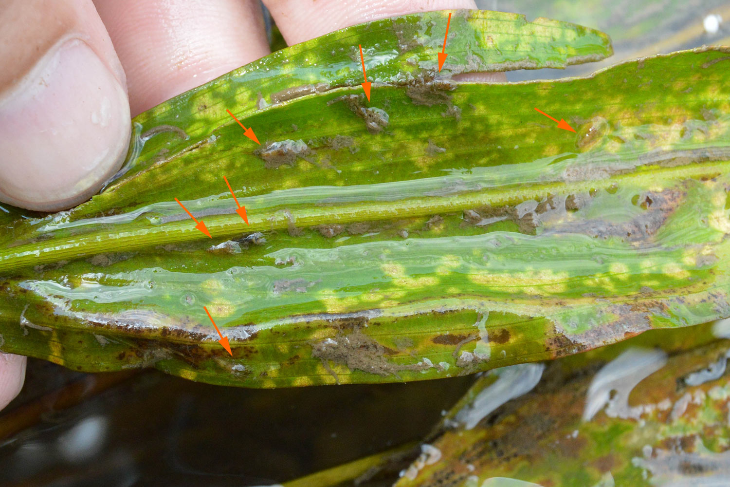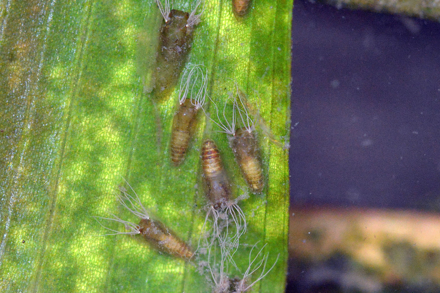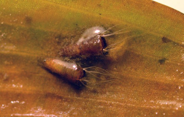 Fig 13. Grupo de pupas de S. erythrocephalum. Esta situación con tantas pupas no era lo normal debajo de las hojas de la planta acuática Potamogeton nodosus. Pero aparecía alguna hoja que se encontraba bien sumergida y era propicia./ Desinsectador 08-2017