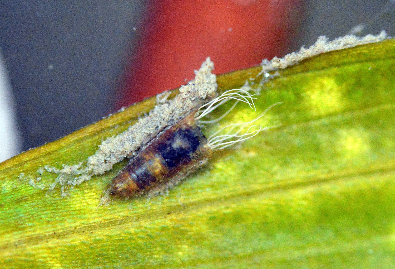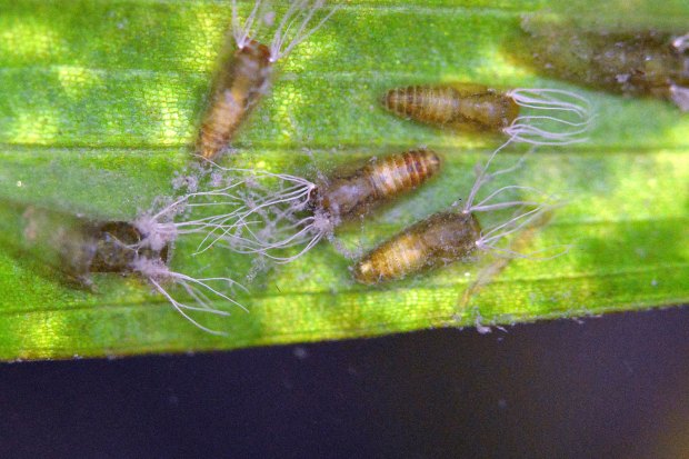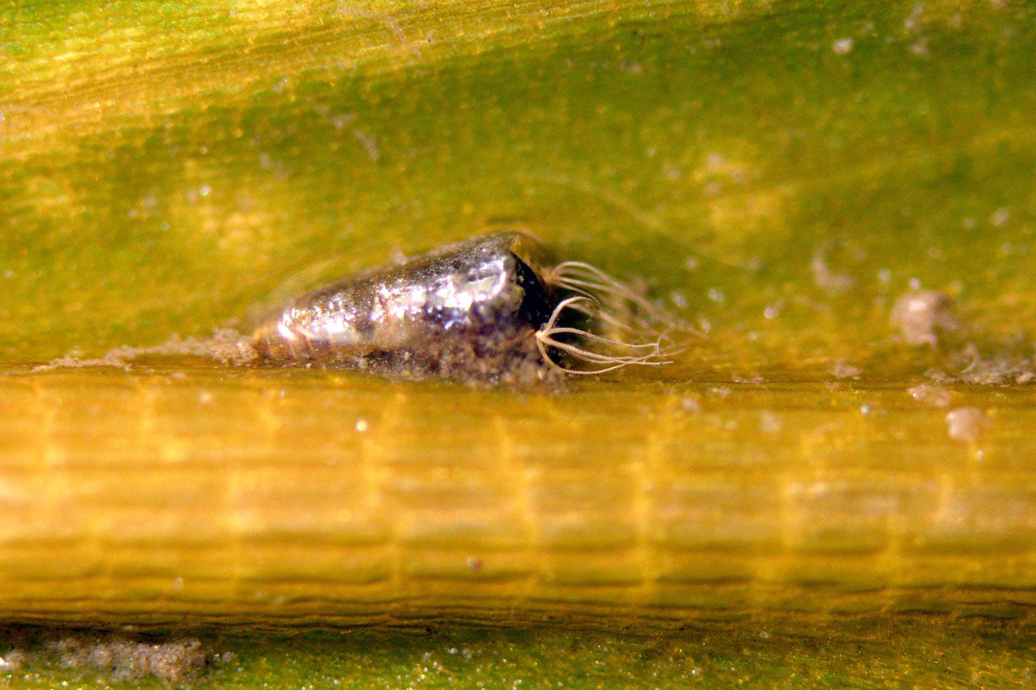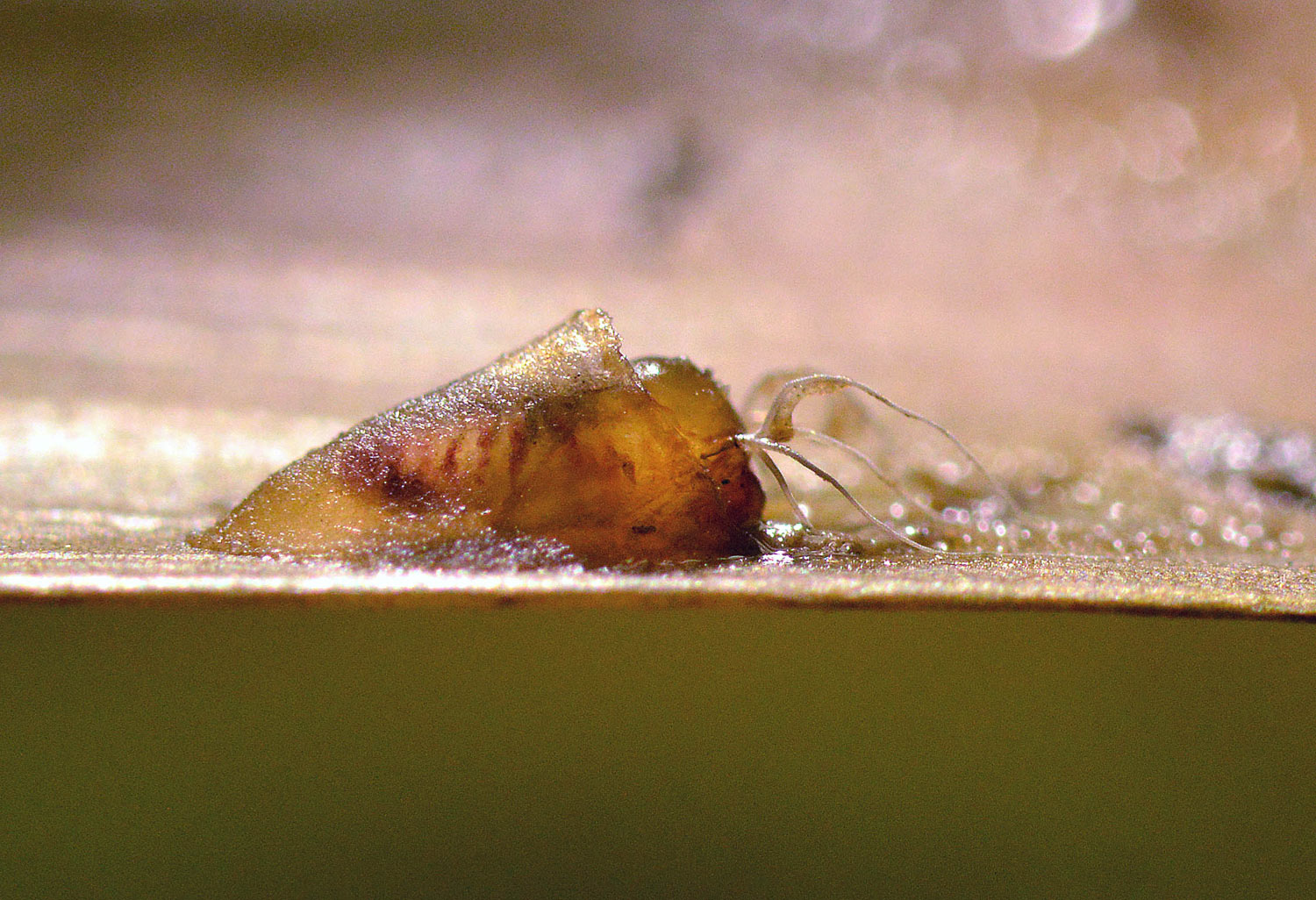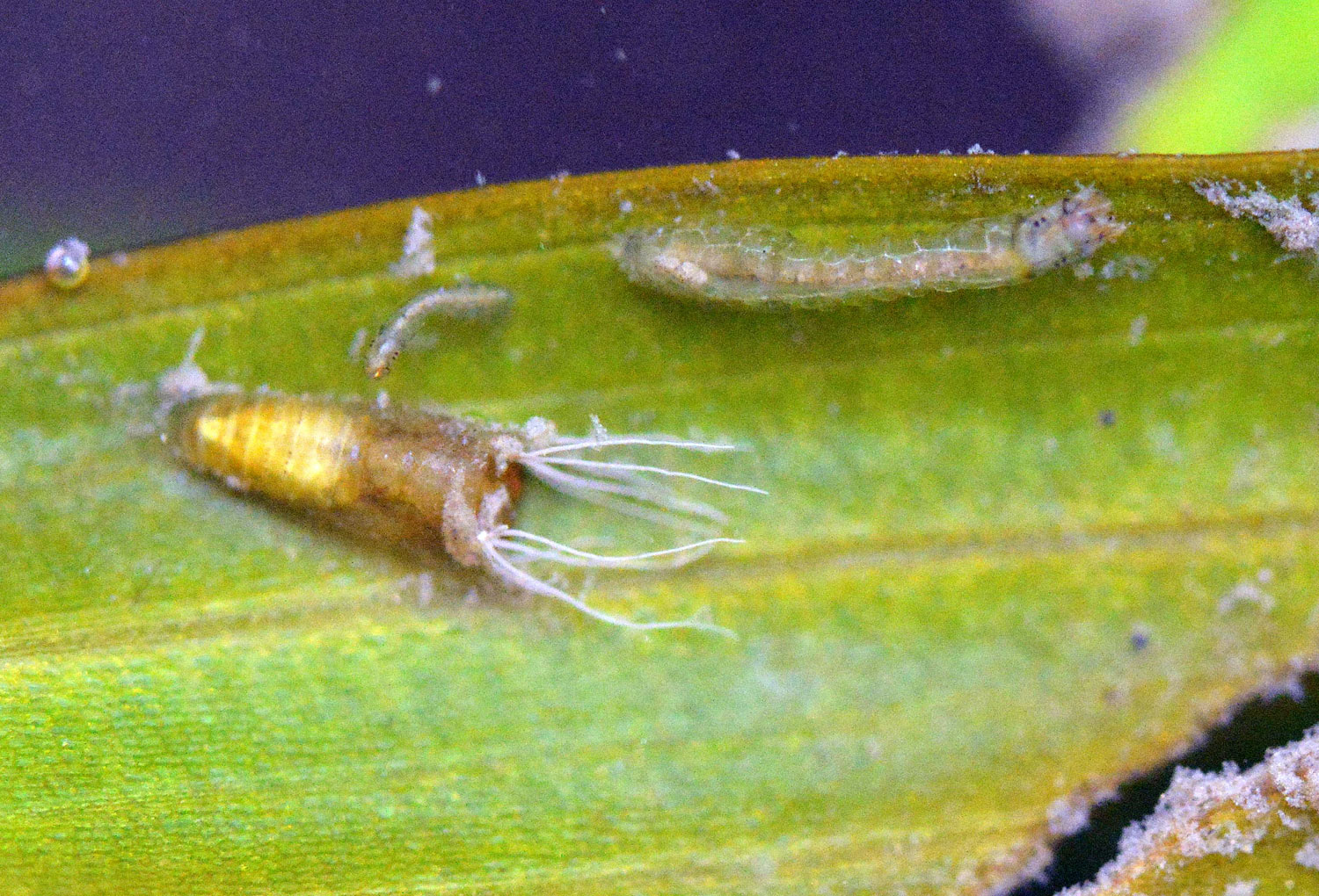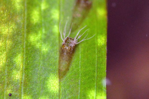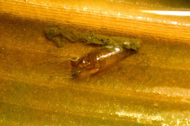Fig 5. Miré debajo de las hojas, pero en pocas vi larvas y pupas de simúlido. En la imagen se puede ver una que albergaba diversas pupas./ Desinsectador 08-2017