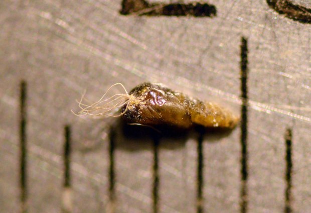 Fig 23. Pupa de S. erythrocephalum sobre una regla donde creo que se pueden ver perfectamente los filamentos respiratorios./ Desinsectador 08-2017