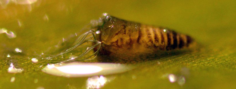 Fig 17. Pupa de S. erythrocephalum fuera del agua donde se pueden ver los filamentos respiratorios./ Desinsectador 08-2017