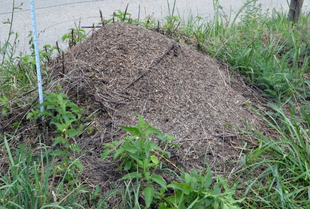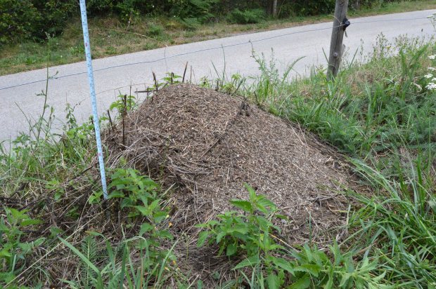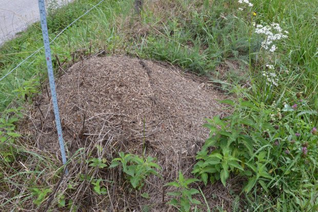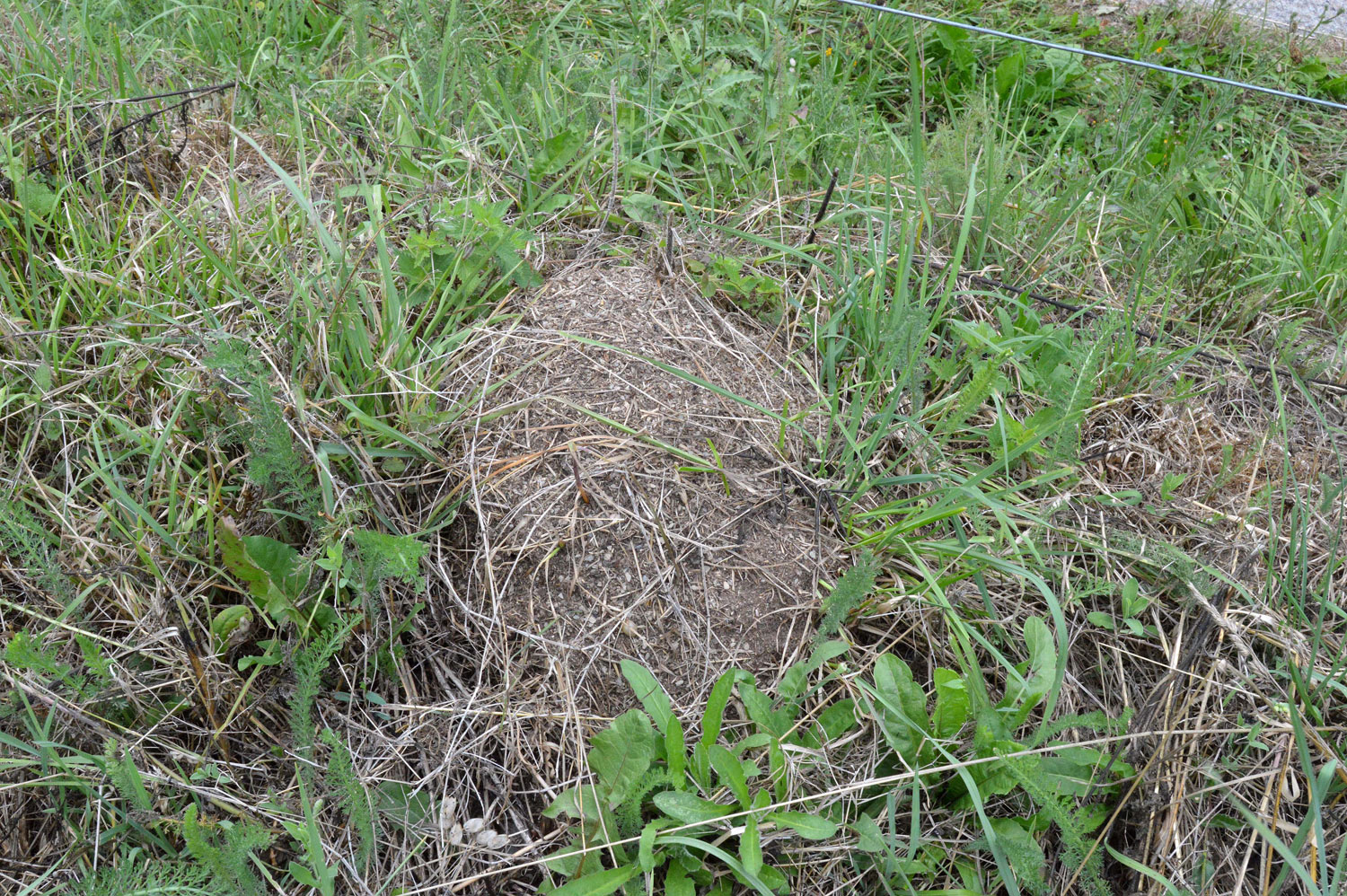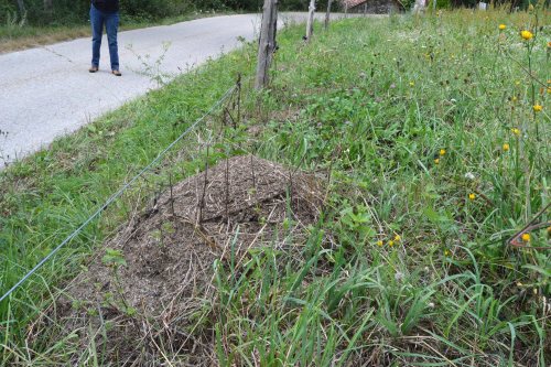Pasada la Font d’en Rafel, observé en el margen de un prado unos pequeños montículos (figura 1). Estaban escondidos entre la vegetación junto al camino y tocando al cercado eléctrico (figura 2). Me paré a observarlos y vi que eran domos de Formica. Pero a diferencia de los domos construidos en bosques de conífera, estos se encontraban en una zona abierta y lejos de árboles. Conté tres. El mayor de unos 40 centímetros de altura. Y el menor de poco más de un palmo. Posiblemente habría alguno mucho más pequeño, pero no lo vi porque la vegetación del prado hacía difícil su localización. Me hizo gran ilusión este encuentro. Estuve un rato tomando fotos y recogiendo una muestra de obreras. Al utilizar el aspirador entomológico, recibí una buena dosis de ácido fórmico segregado por las obreras. El material del que estaba compuesto el domo era de todo tipo de materiales del prado. Principalmente pequeños palitos, hojas secas y muchas piedrecitas, lo cual da consistencia al montículo (figuras 8 y 9). Ello da cuenta del enorme esfuerzo que dedican a construirlo.