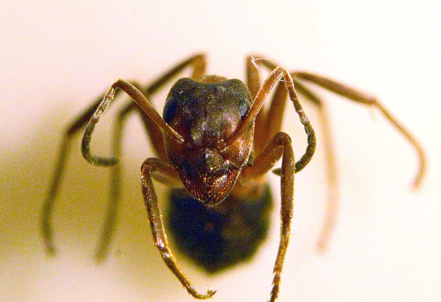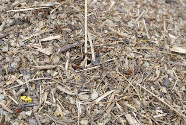 Todo lo observado en cuanto a ubicación y materiales del domo me hizo pensar que estaba ante una especie diferente de las que construyen domos en bosques. En casa, al observar la cabeza de las obreras vi que la parte superior estaba escotada. En la imagen número 13, se puede ver una vista frontal de la cabeza de una obrera donde se ve claramente esta hendidura. Digamos que la cabeza es en forma de corazón. Esto me indicó que estaba ante especies del subgénero Coptorformica. Desde lejos, el aspecto de las obreras es muy parecido a las otras que forman domos con acículas y también su coloración roja y negra. De igual manera, tienen el gastro negro, el tórax rojo y la cabeza de ambos colores. Sin embargo, las obreras de Coptoformica no tienen nítidamente separadas en la cabeza las partes negras de las rojas, sino que consiste en un degradado. En la imagen número 14, se pueden ver obreras sobre papel milimetrado. Aproximadamente miden entre 4 y 6 mm.