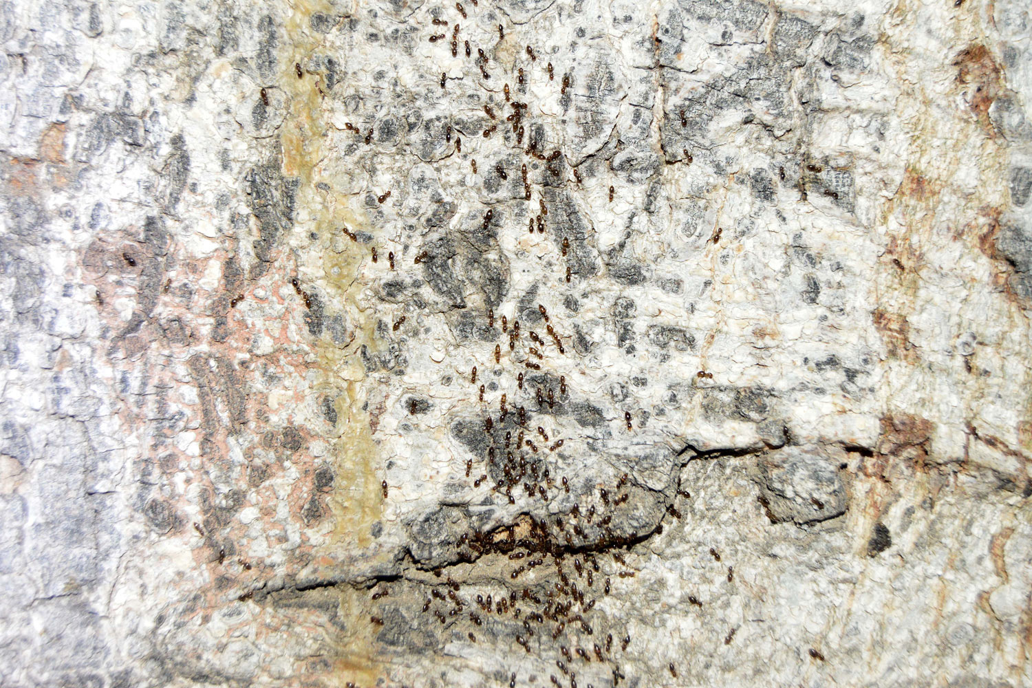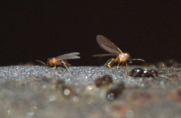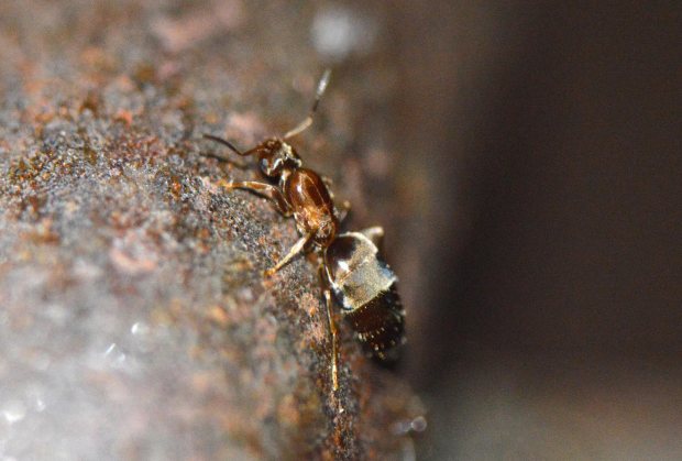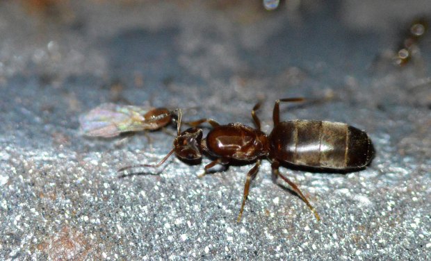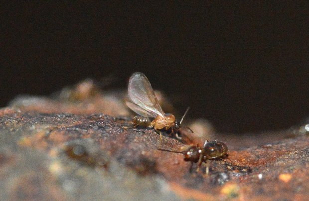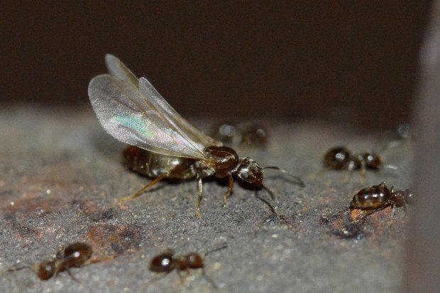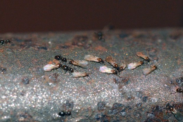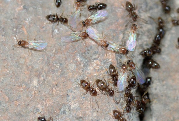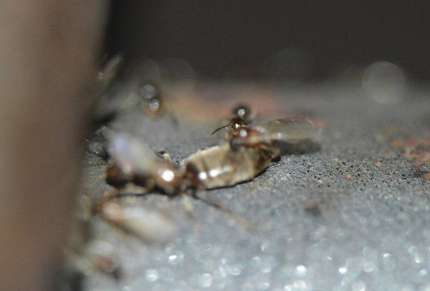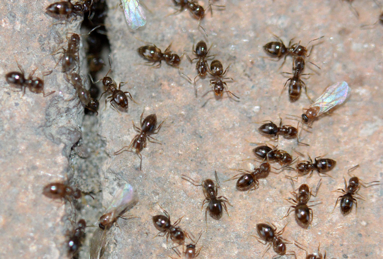 Fig 6. Obreras y machos de Brachymyrmex patagonicus saliendo de la grieta de una pared./ C. Pradera 06-2017