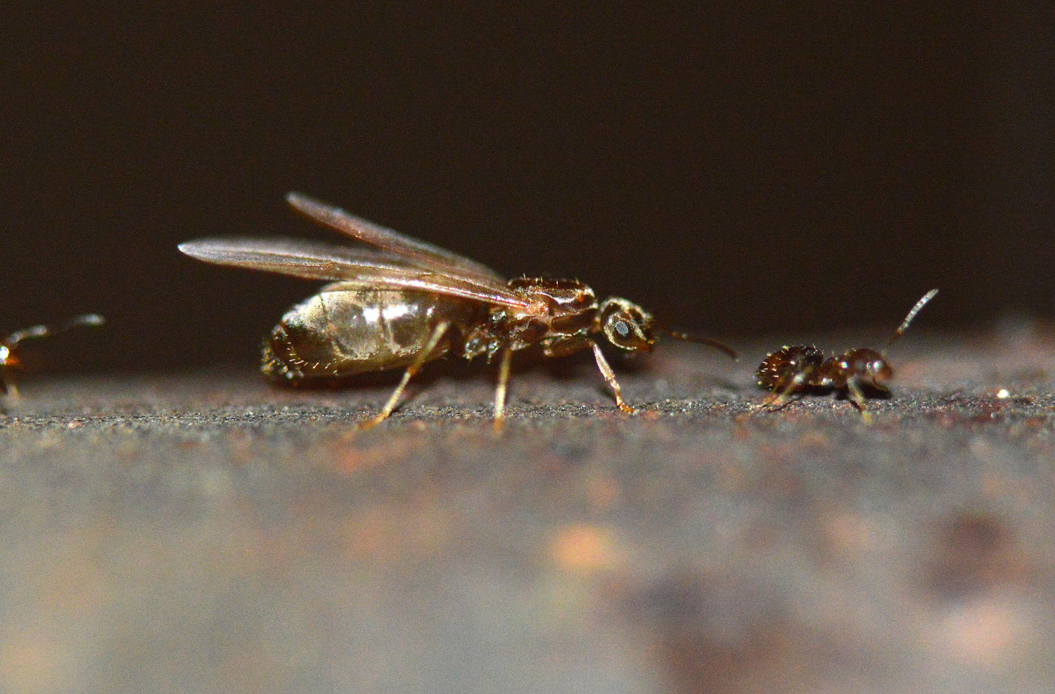 Durante todo el día, pudimos observar la gran población de la colonia, ya de por sí densa al ser una especie que en Almería se presenta como polidómica y poligínica. Al atardecer empezaron a salir un mayor número de obreras por todas las grietas por donde entraban y salían (figuras 6 a 8). Se mueven con una actitud nerviosa y diferente a sus movimientos por las pistas. Y se dirigen a las partes altas como plantas, árboles, etc. (figuras 9 y 10). En el centro de la Plaza de Colón hay unas jardineras rodeadas por una barandilla metálica. Allí se dirigió gran parte de las obreras (figuras 11 y 12). Luego fueron emergiendo gran número de machos alados que tienen un tamaño similar a las obreras pero poseen alas (figuras 13 a 16). Y posteriormente aparecieron las reinas, cuyo tamaño es mayor, pero se presentaron en menor número que los machos. Algunas reinas aparecen completas con sus alas. Otras, en cambio, ya aparecen sin las alas.