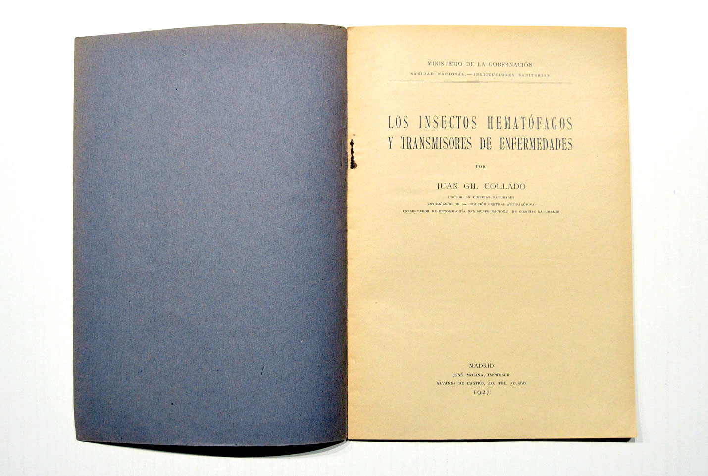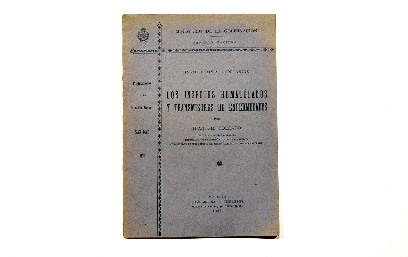 – Juan Gil Collado. 1927. Los insectos hematófagos y transmisores de enfermedades. Publicaciones de la Dirección General de Sanidad, Ministerio de la Gobernación, Madrid. 48 pp. 22 x 15’5 cm.