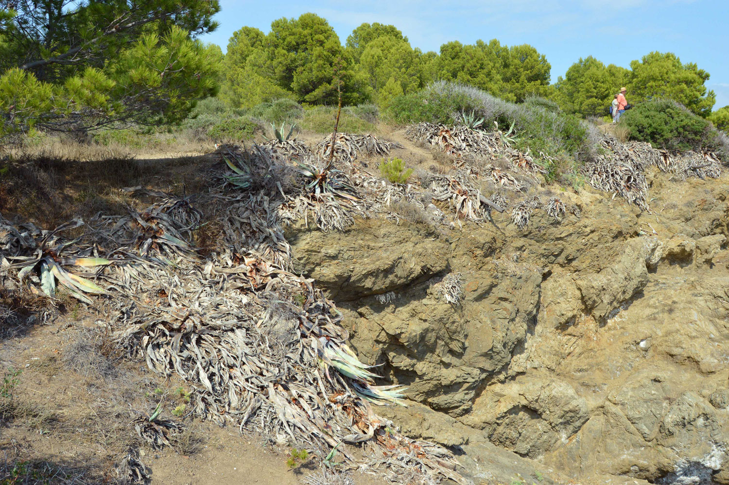 Fig 1. Agaves arrasados en la punta de Cap Ras por picudo negro del agave (Scyphophorus acupunctatus)./ C. Pradera 09-2017
