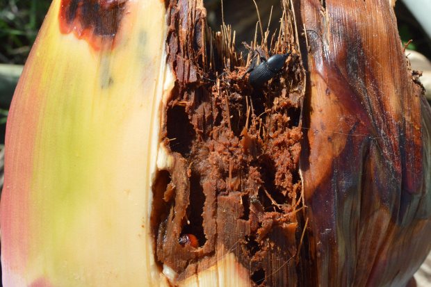 Fig 7. Picudo negro del agave (Scyphophorus acupunctatus) introduciéndose en el interior de una planta./ C. Pradera 09-2017