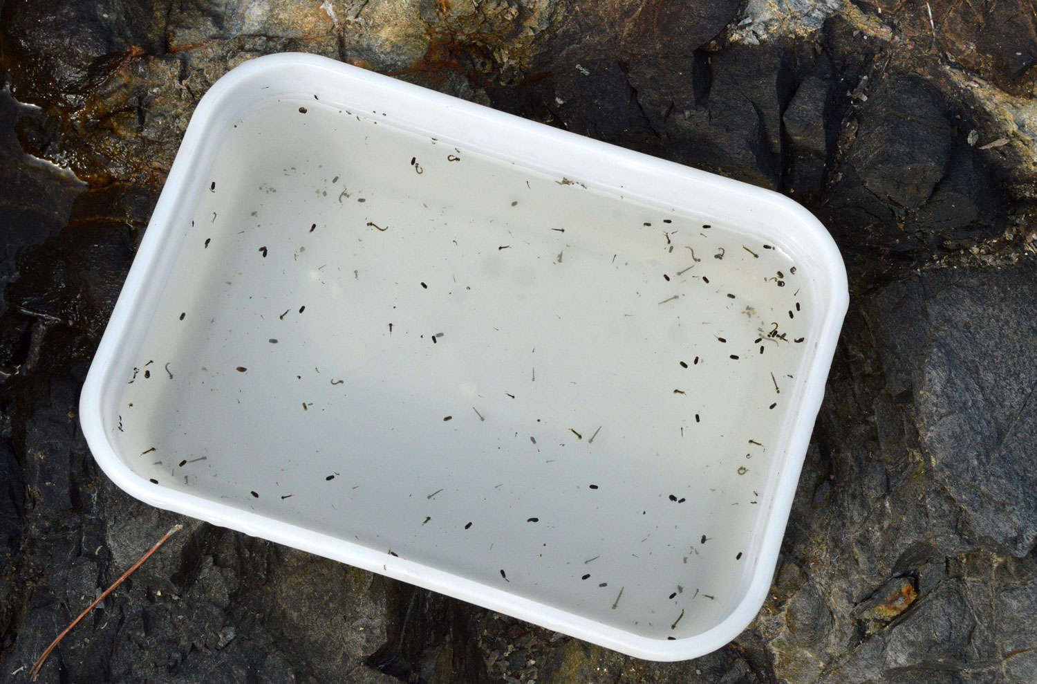 Me parecen muy interesantes las especies de mosquitos (Culicidae) cuyas larvas se desarrollan en huecos de rocas. El año pasado descubrí por casualidad el mosquito Aedes vittatus cuando un sábado de verano paré a comer en la orilla del río Ter [1]. Me parece extraordinario el hecho de que una especie se especialice en este tipo de huecos donde deposita los huevos a la espera de que llueva. Ahora bien, mientras Aedes vittatus necesita agua dulce, existen otras especies como Aedes mariae que necesitan agua salada. Y es por ello que necesitan huecos de roca junto al mar.