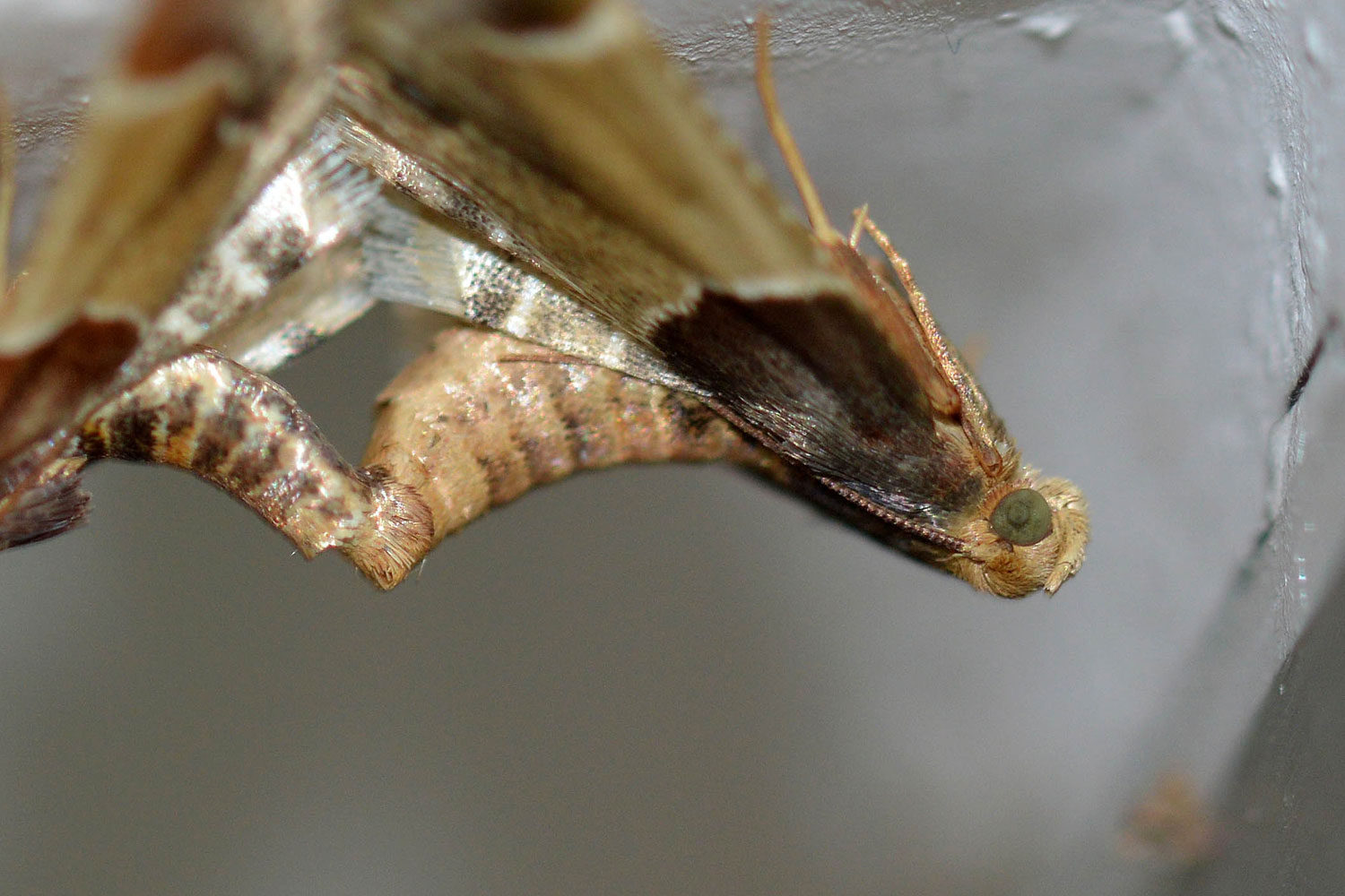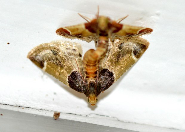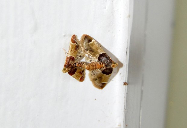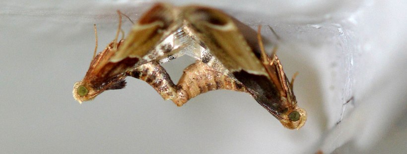 Hace unos días encontré en el techo de la galería de casa una pareja de polillas realizando la cópula. Al ver que se trataba de ejemplares de polilla parda de la harina (Pyralis farinalis) fui a por la cámara. Me subí a una escalera y disfruté tomando fotografías. No se inmutaron. Siguieron a lo suyo.