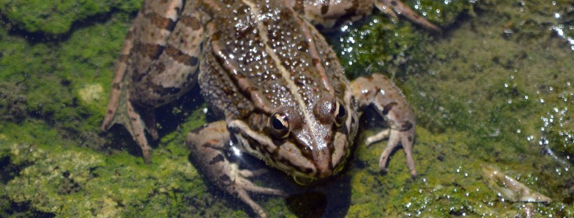 La rana verde ibérica (Pelophylax perezi) es también conocida como rana común [1]. Es relativamente fácil encontrar un ejemplar si nos acercamos a una charca o estanque, a abrevaderos, a cursos de agua lenta, a arrozales, etc. Se encuentra prácticamente en toda la Península Ibérica. Y a esta gran distribución y abundancia ayuda el hecho de que soporta aguas contaminadas y salobres. Es también relativamente fácil identificar esta especie de anfibio. Sin embargo, lo que no es fácil es distinguirla de su híbrido al que los estudiosos llaman rana híbrida de Graf (Pelophylax klepton grafi) [2]. De hecho, yo no sé distinguirlas si no es por su tamaño. La rana híbrida de Graf es de mayor tamaño que la verde ibérica. Unos 8 cm de largo frente a 6’5 cm.