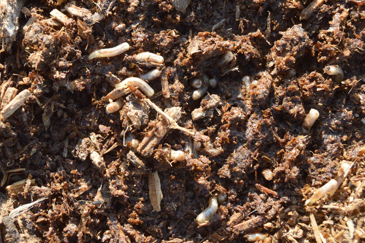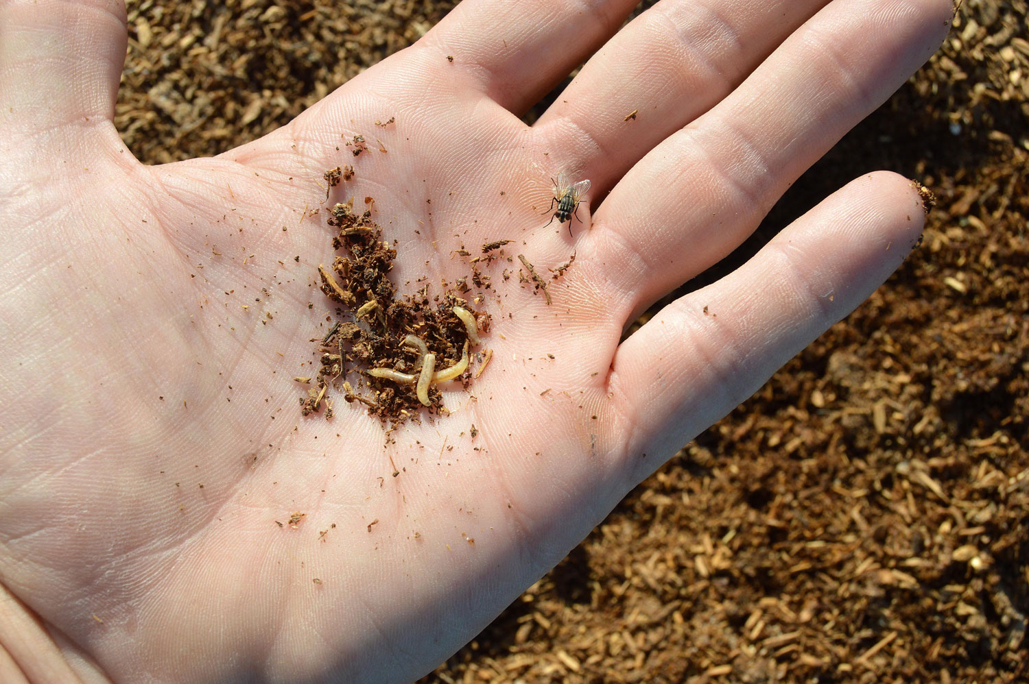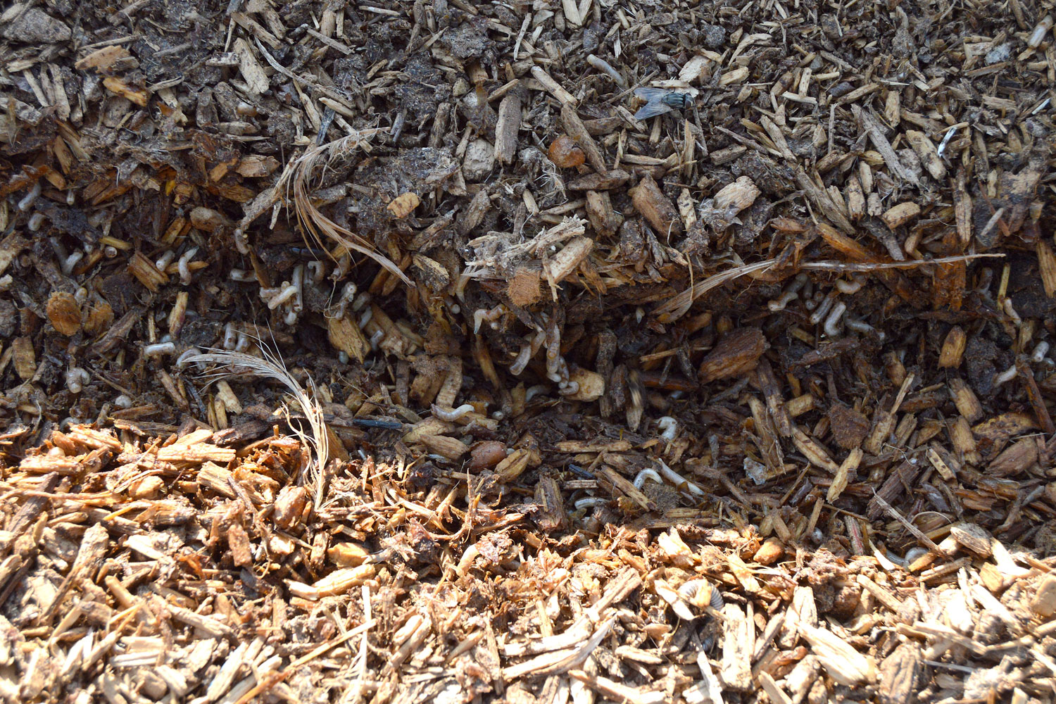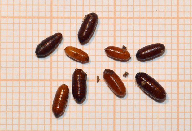 El origen de esta súbita aparición de adultos no se encuentra lejos. Pero no es fácil dar con la zona de cría. Hemos de tener en cuenta que las larvas necesitan materia orgánica en descomposición para su desarrollo, preferentemente, de origen animal. Y buscar la fuente de alimentación. Un lugar ideal es el estiércol que se utiliza para abonar los campos que es origen de muchos problemas de mosca doméstica. En las imágenes de esta entrada, se puede ver gran cantidad de estiércol acumulado en sacas y bajo una gran lona azul. Allí recogí un buen número de larvas días atrás para su observación. Al final se pueden imágenes de algunos adultos que han salido de las pupas.