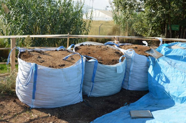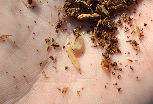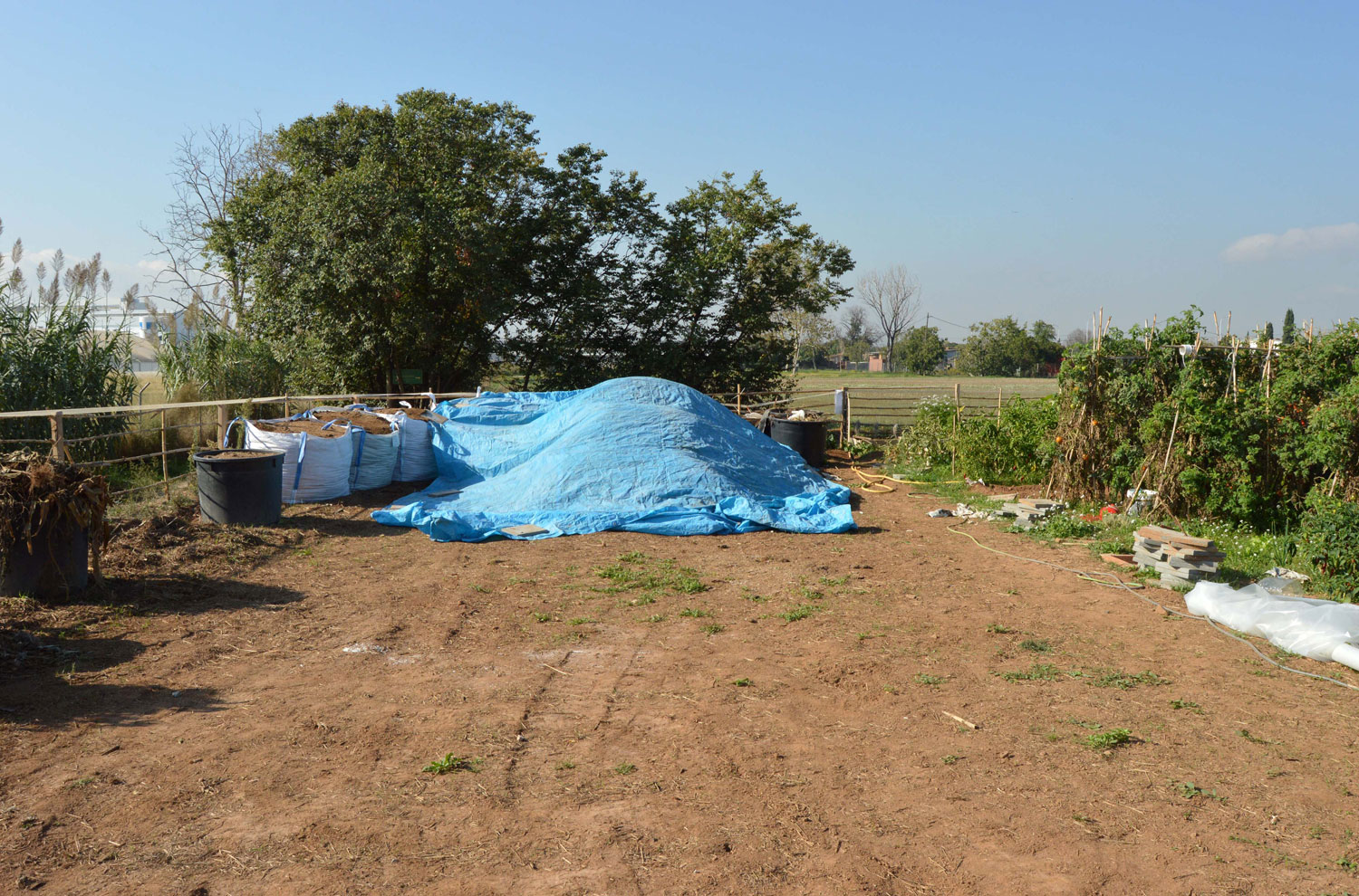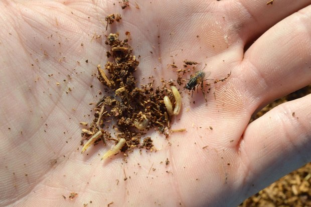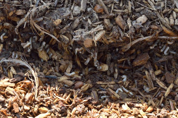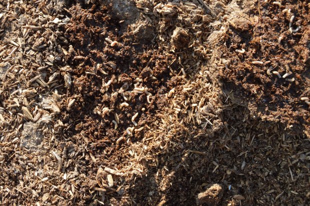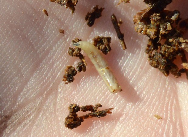 El origen de esta súbita aparición de adultos no se encuentra lejos. Pero no es fácil dar con la zona de cría. Hemos de tener en cuenta que las larvas necesitan materia orgánica en descomposición para su desarrollo, preferentemente, de origen animal. Y buscar la fuente de alimentación. Un lugar ideal es el estiércol que se utiliza para abonar los campos que es origen de muchos problemas de mosca doméstica. En las imágenes de esta entrada, se puede ver gran cantidad de estiércol acumulado en sacas y bajo una gran lona azul. Allí recogí un buen número de larvas días atrás para su observación. Al final se pueden imágenes de algunos adultos que han salido de las pupas.