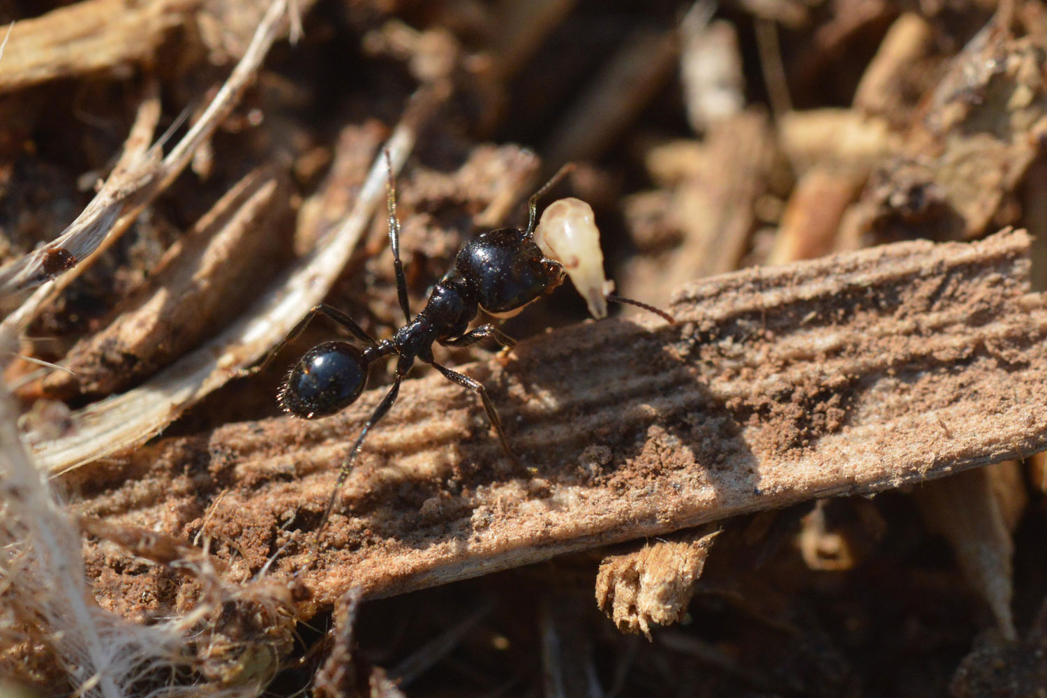 Como nota curiosa están las imágenes 11 y 12. Se puede ver una obrera de hormiga granívora Messor barbarus con una larva de mosca atrapada en sus mandíbulas. Esta especie se alimenta principalmente de semillas de plantas. Pero también puede atrapar algún insecto que vendrá muy bien para el desarrollo de sus larvas. Al remover el estiércol, dejé al descubierto algunas larvas que fueron cazadas por algunas obreras que pasaban por allí.
