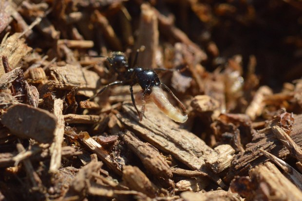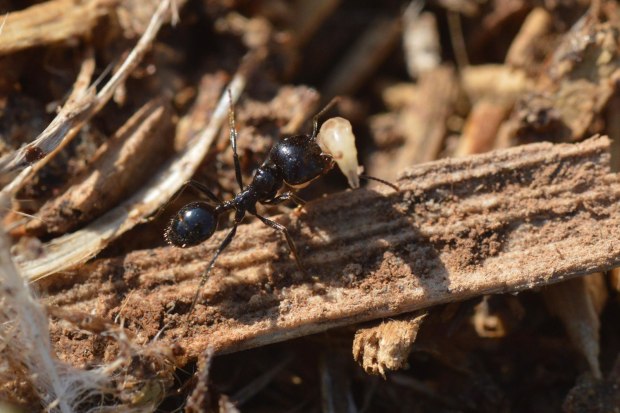 Fig 11. Hormiga granívora (Messor barbarus) con larva de mosca doméstica (Musca domestica)./ Desinsectador 10-2017