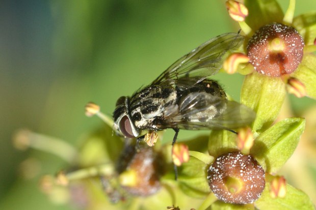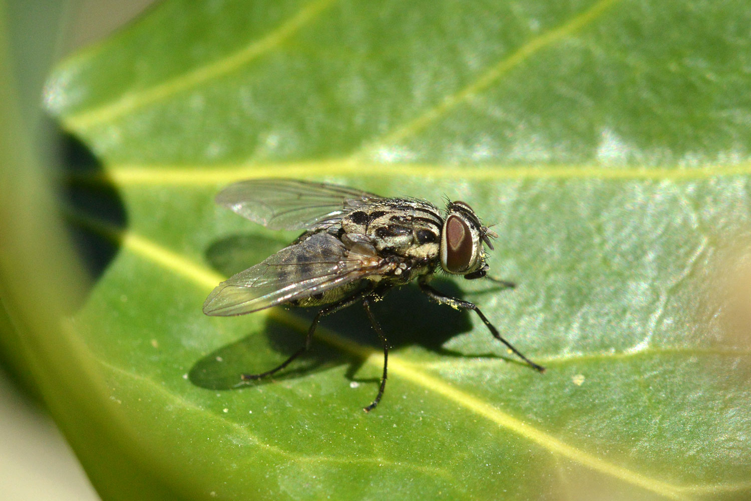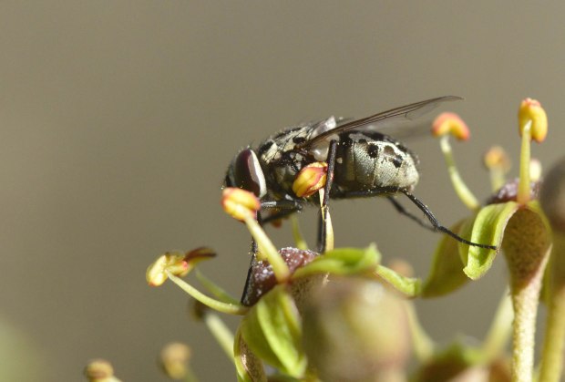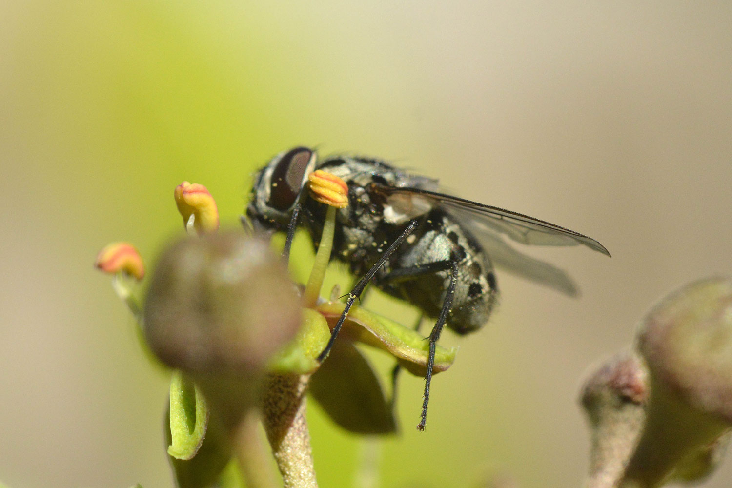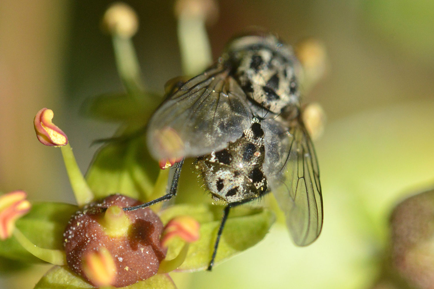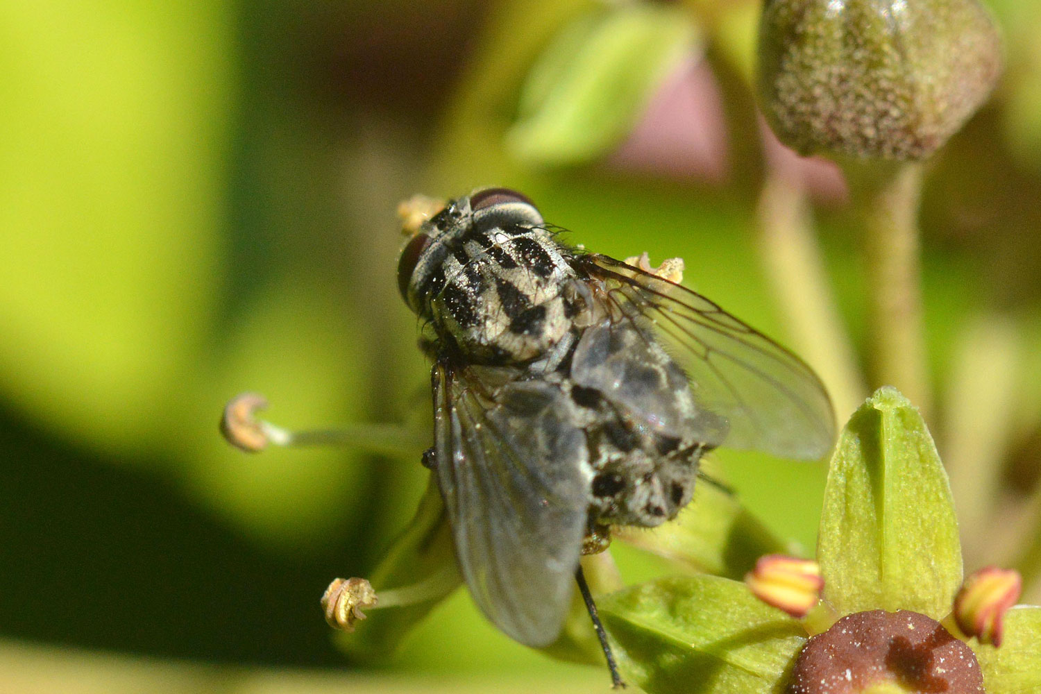 Después de observar un rato, decidí tomar algunas fotografías. Al poco, mi atención se sintió atraída por una mosca preciosa que había visto, pero que no conocía. Estuve detrás de ella intentando retratarla al detalle. Al llegar a casa, consulté el catálogo de ‘Catálogo de los Diptera de España, Portugal y Andorra (Insecta)’ en su apartado dedicado a los múscidos (Muscidae) [1]. Llegué a la conclusión de que la mosca era de la especie Graphomya maculata. Me pareció apropiado el nombre, ya que remarca el bonito juego de manchas negras. De hecho, el número y forma de estas manchas hacen inconfundibles a las especies del mismo género.